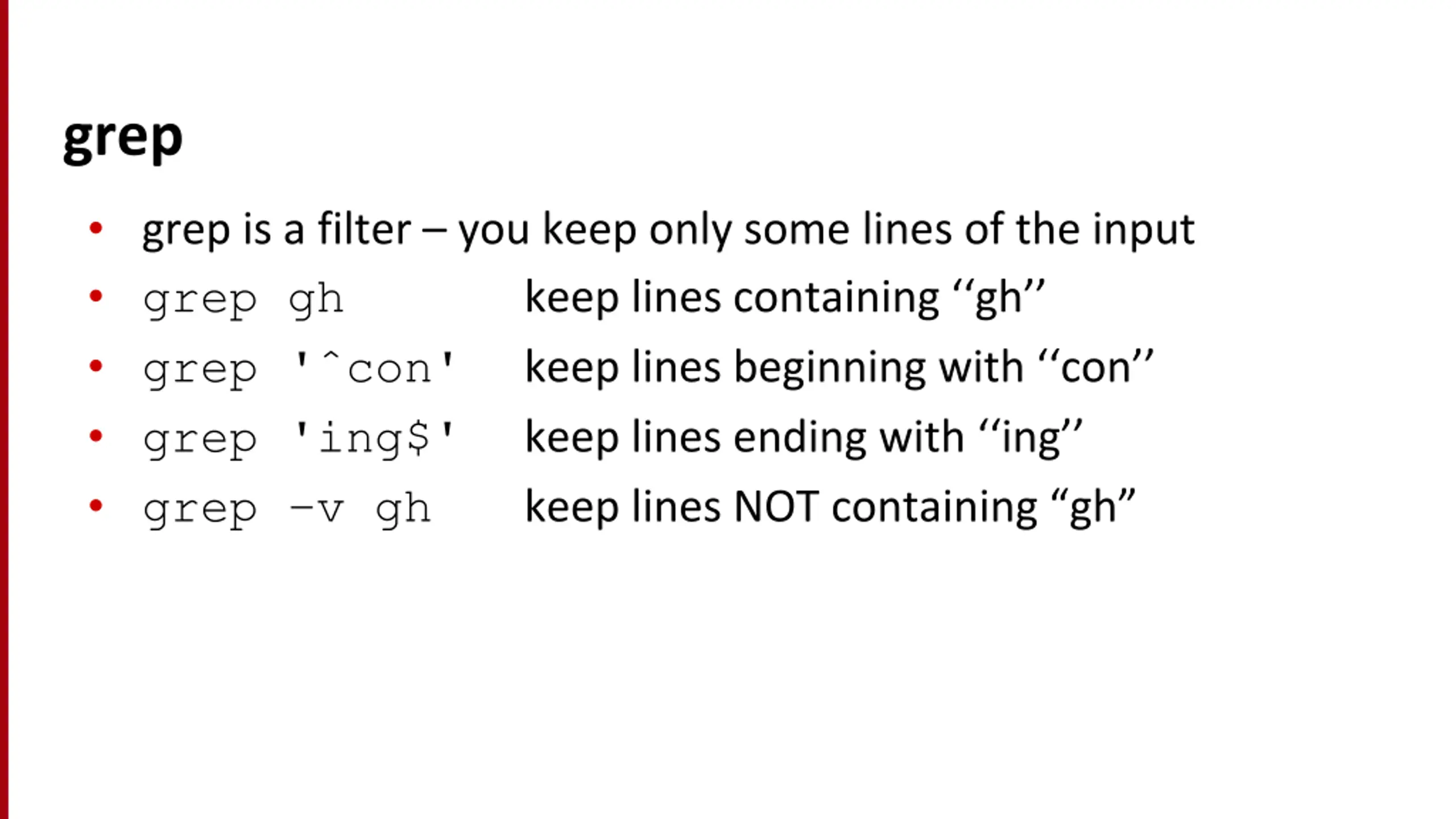 grep grep is a filter you keep only some lines of the input grep gh keep lines containing gh grep ' con' keep lines beginning with con grep 'ing$' keep lines ending with ing grep v gh keep lines NOT containing gh