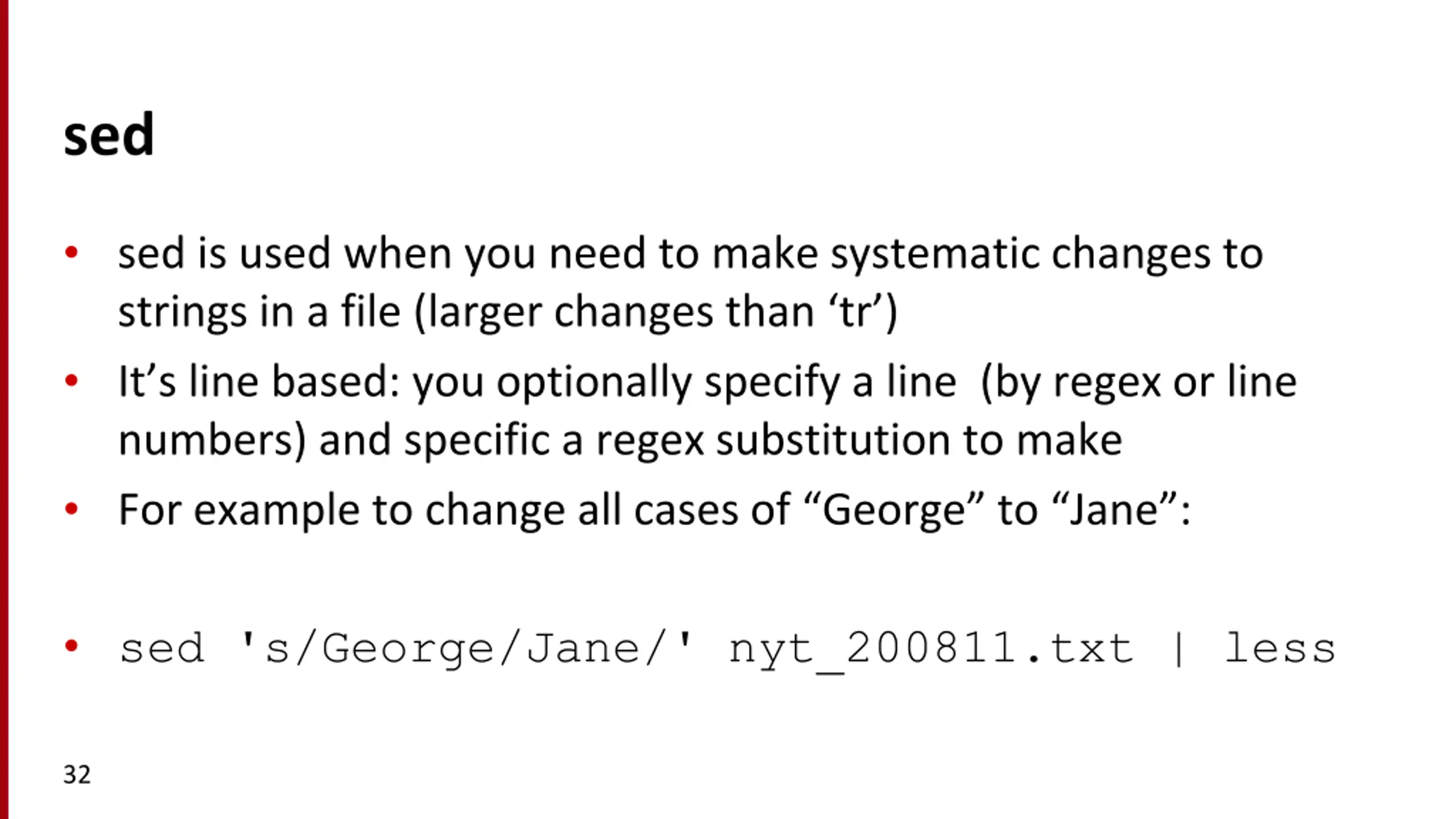 sed sed is used when you need to make systematic changes to strings in a file (larger changes than tr ) It s line based: you optionally specify a line (by regex or line numbers) and specific a regex substitution to make For example to change all cases of George to Jane : sed 's/George/Jane/' nyt_200811.txt | less 32