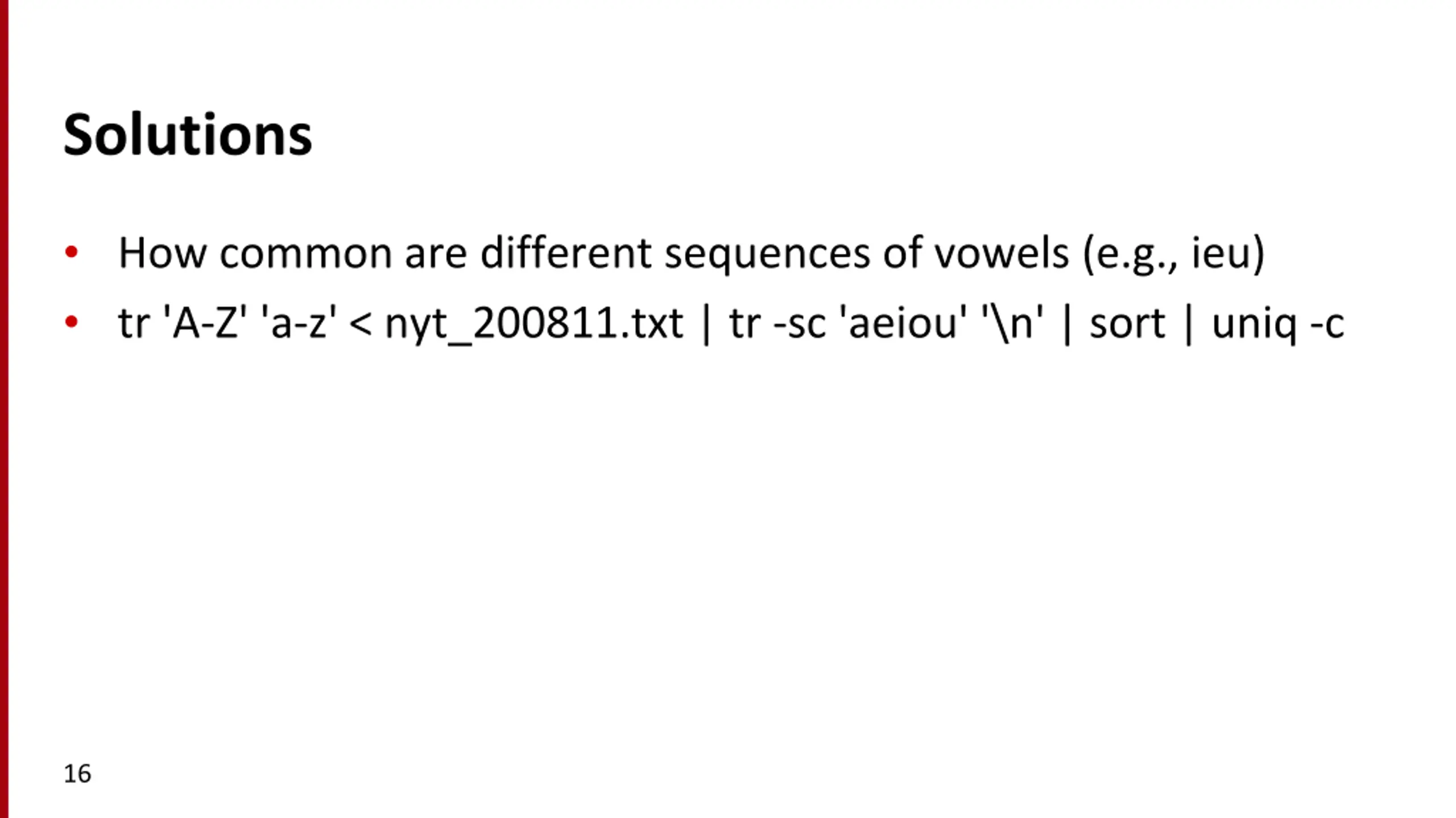Solutions How common are different sequences of vowels (e.g., ieu) tr 'A-Z' 'a-z' < nyt_200811.txt | tr -sc 'aeiou' '\n' | sort | uniq -c 16