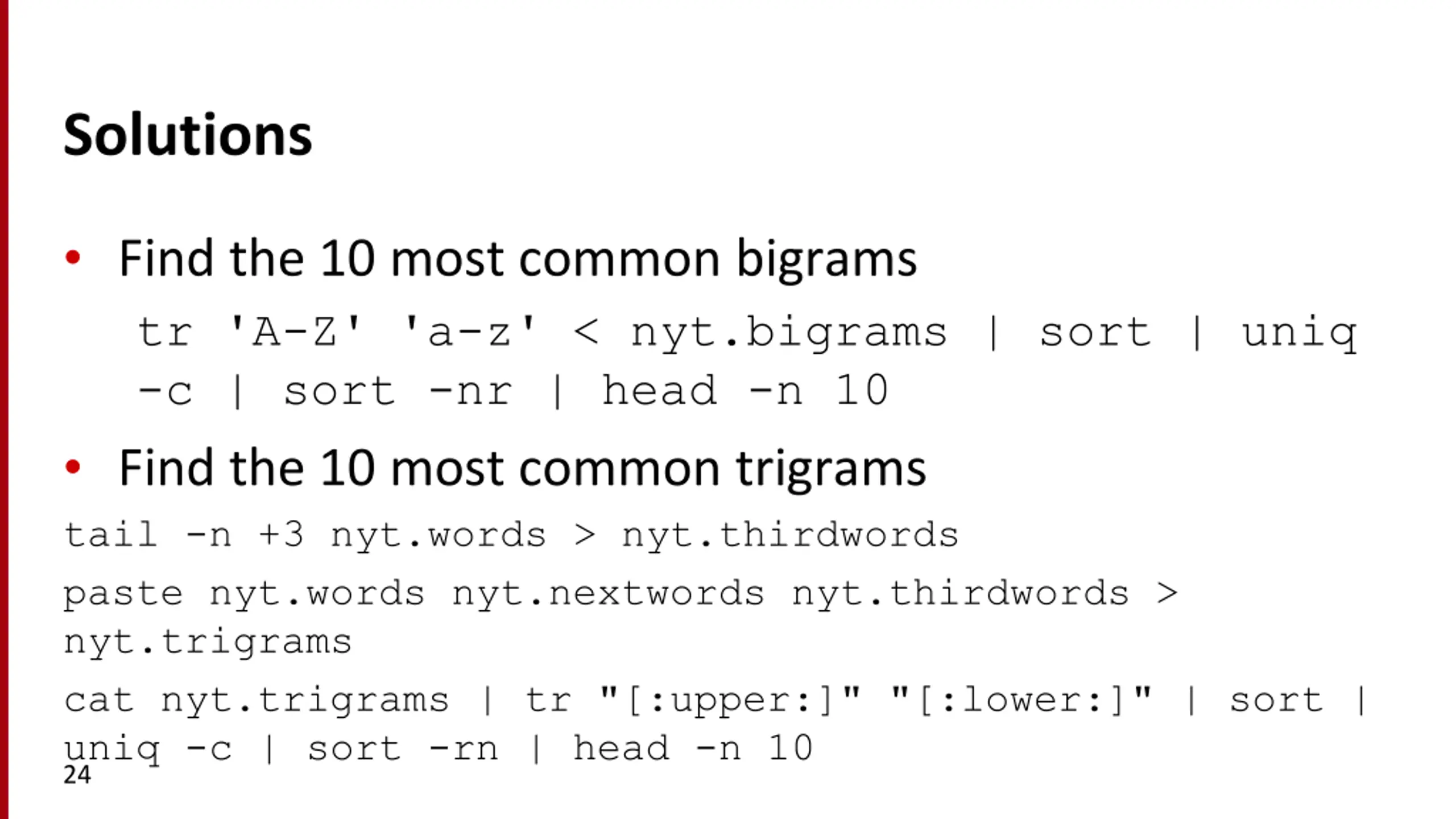 Solutions Find the 10 most common bigrams tr 'A-Z' 'a-z' < nyt.bigrams | sort | uniq -c | sort -nr | head -n 10 Find the 10 most common trigrams tail -n +3 nyt.words > nyt.thirdwords paste nyt.words nyt.nextwords nyt.thirdwords > nyt.trigrams cat nyt.trigrams | tr "[:upper:]" "[:lower:]" | sort | uniq -c | sort -rn | head -n 10 24