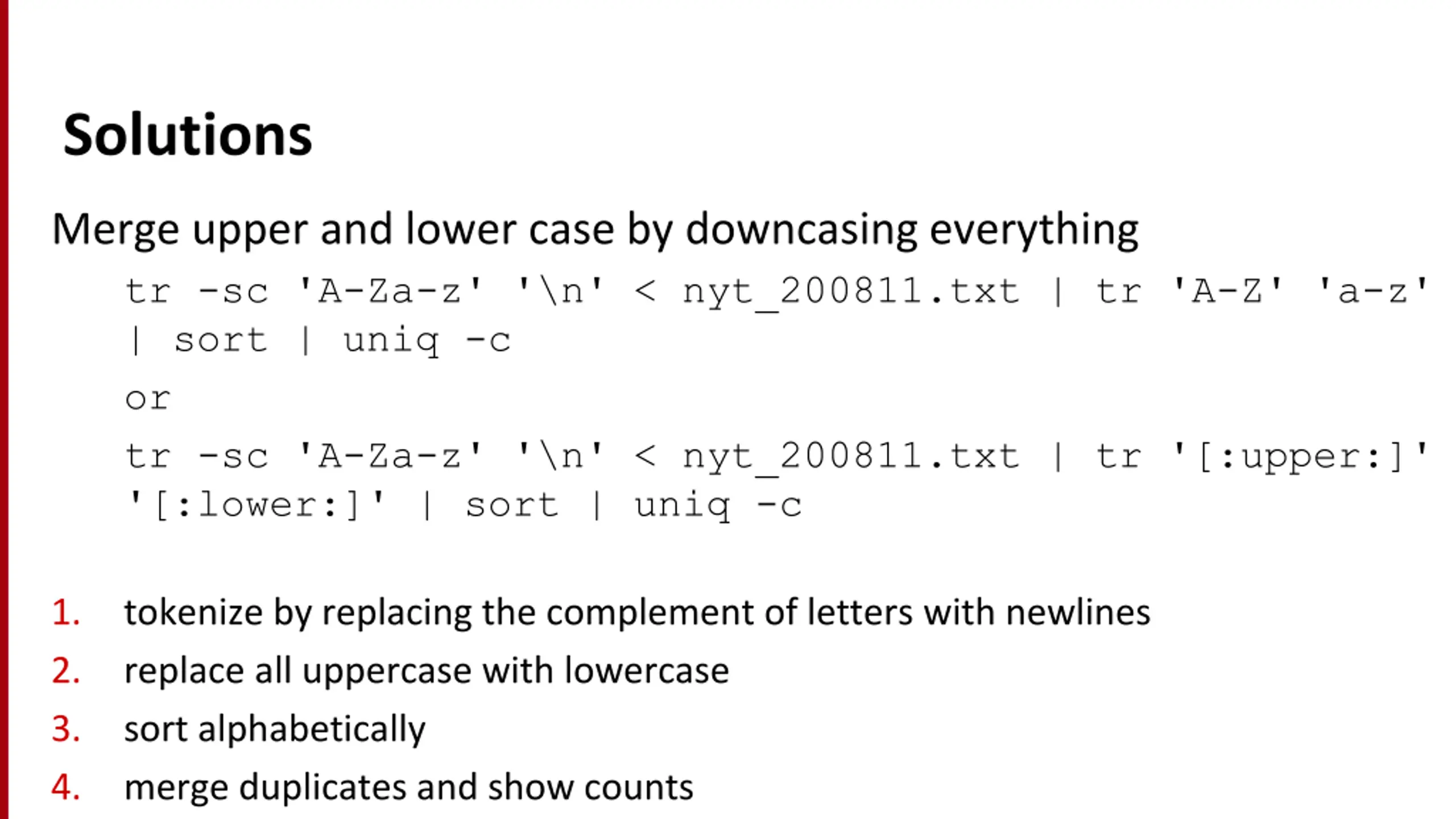 Solutions Merge upper and lower case by downcasing everything tr -sc 'A-Za-z' '\n' < nyt_200811.txt | tr 'A-Z' 'a-z' | sort | uniq -c or tr -sc 'A-Za-z' '\n' < nyt_200811.txt | tr '[:upper:]' '[:lower:]' | sort | uniq -c 1. 2. 3. 4. tokenize by replacing the complement of letters with newlines replace all uppercase with lowercase sort alphabetically merge duplicates and show counts