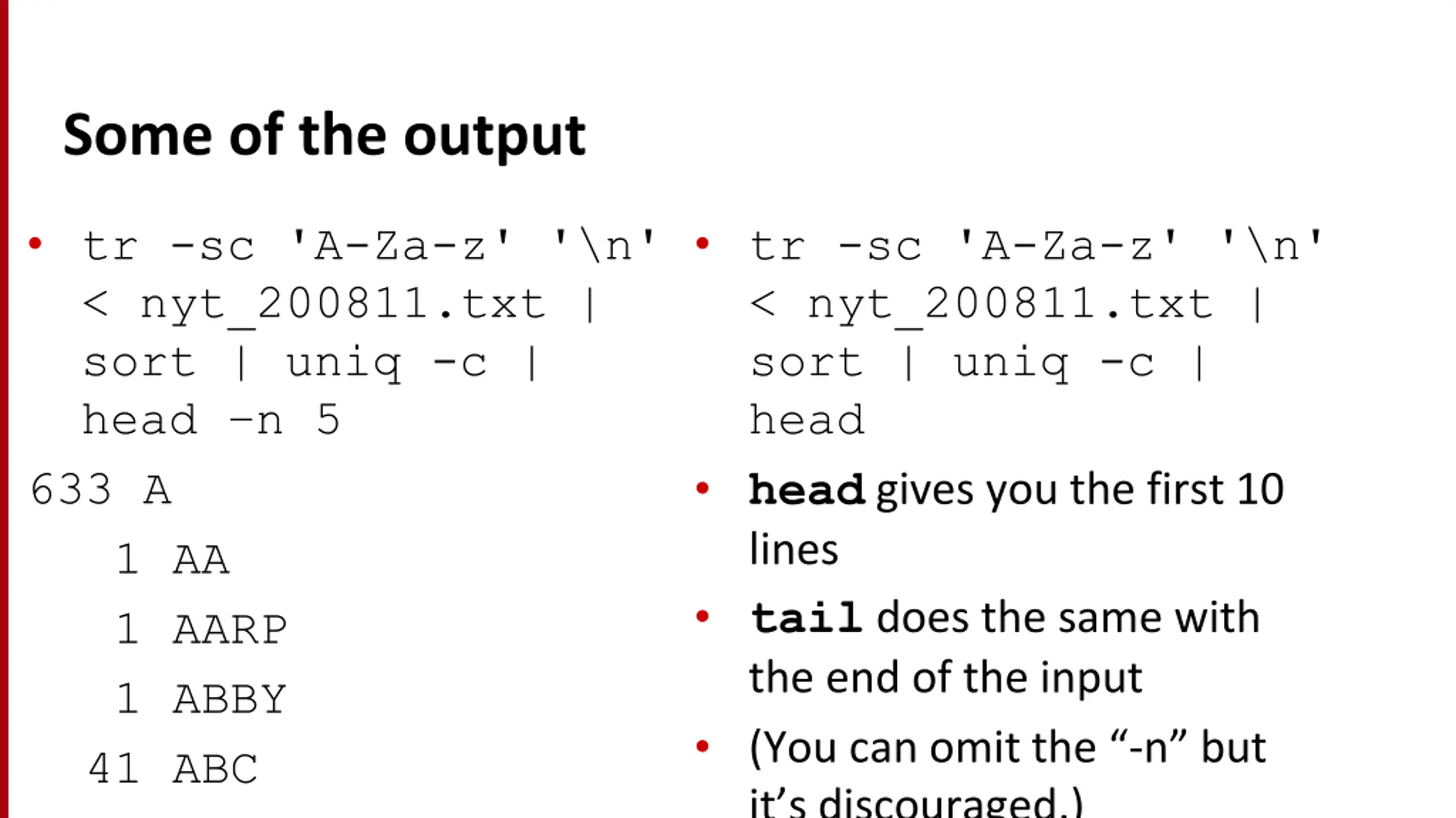 Some of the output tr -sc 'A-Za-z' '\n' < nyt_200811.txt | sort | uniq -c | head n 5 633 A 1 AA 1 AARP 1 ABBY 41 ABC tr -sc 'A-Za-z' '\n' < nyt_200811.txt | sort | uniq -c | head head gives you the first 10 lines tail does the same with the end of the input (You can omit the -n but it s discouraged.)