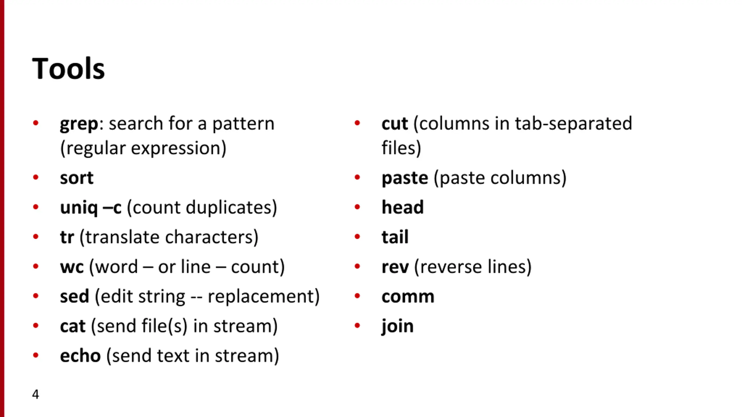 Tools grep: search for a pattern (regular expression) sort uniq c (count duplicates) tr (translate characters) wc (word or line count) sed (edit string -- replacement) cat (send file(s) in stream) echo (send text in stream) cut (columns in tab-separated files) paste (paste columns) head tail rev (reverse lines) comm join 4