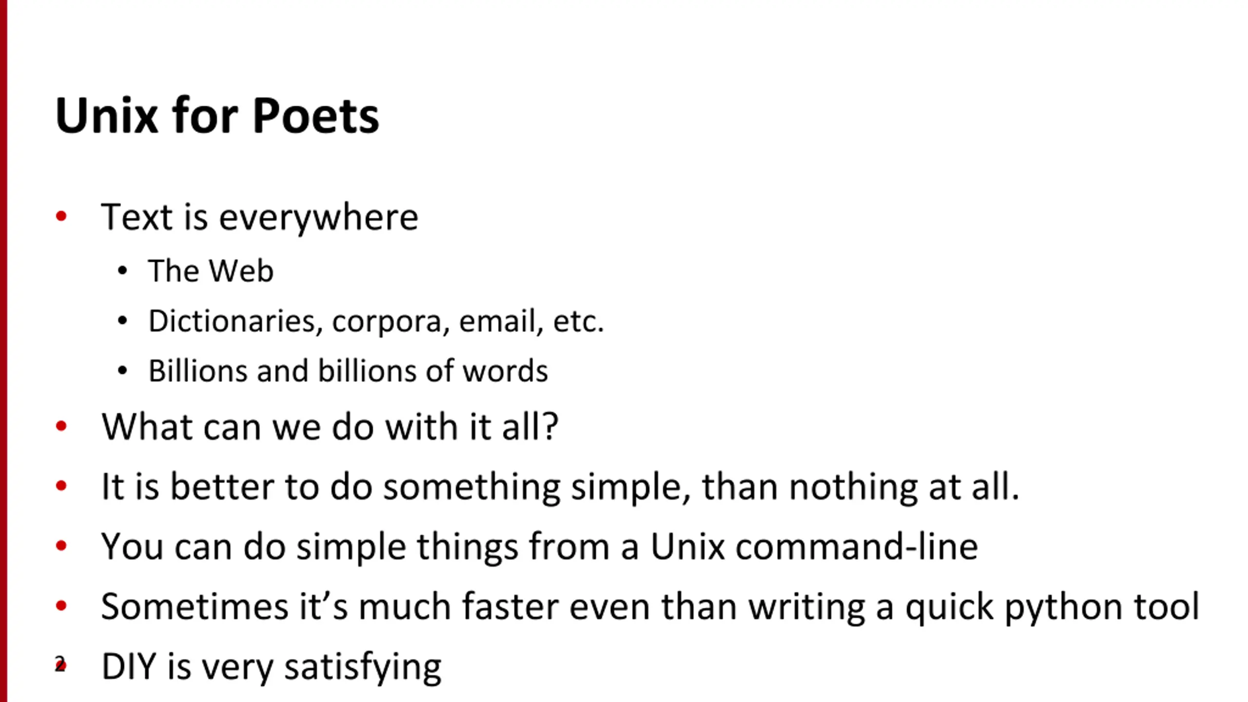 Unix for Poets Text is everywhere The Web Dictionaries, corpora, email, etc. Billions and billions of words What can we do with it all? It is better to do something simple, than nothing at all. You can do simple things from a Unix command-line Sometimes it s much faster even than writing a quick python tool DIY is very satisfying 2