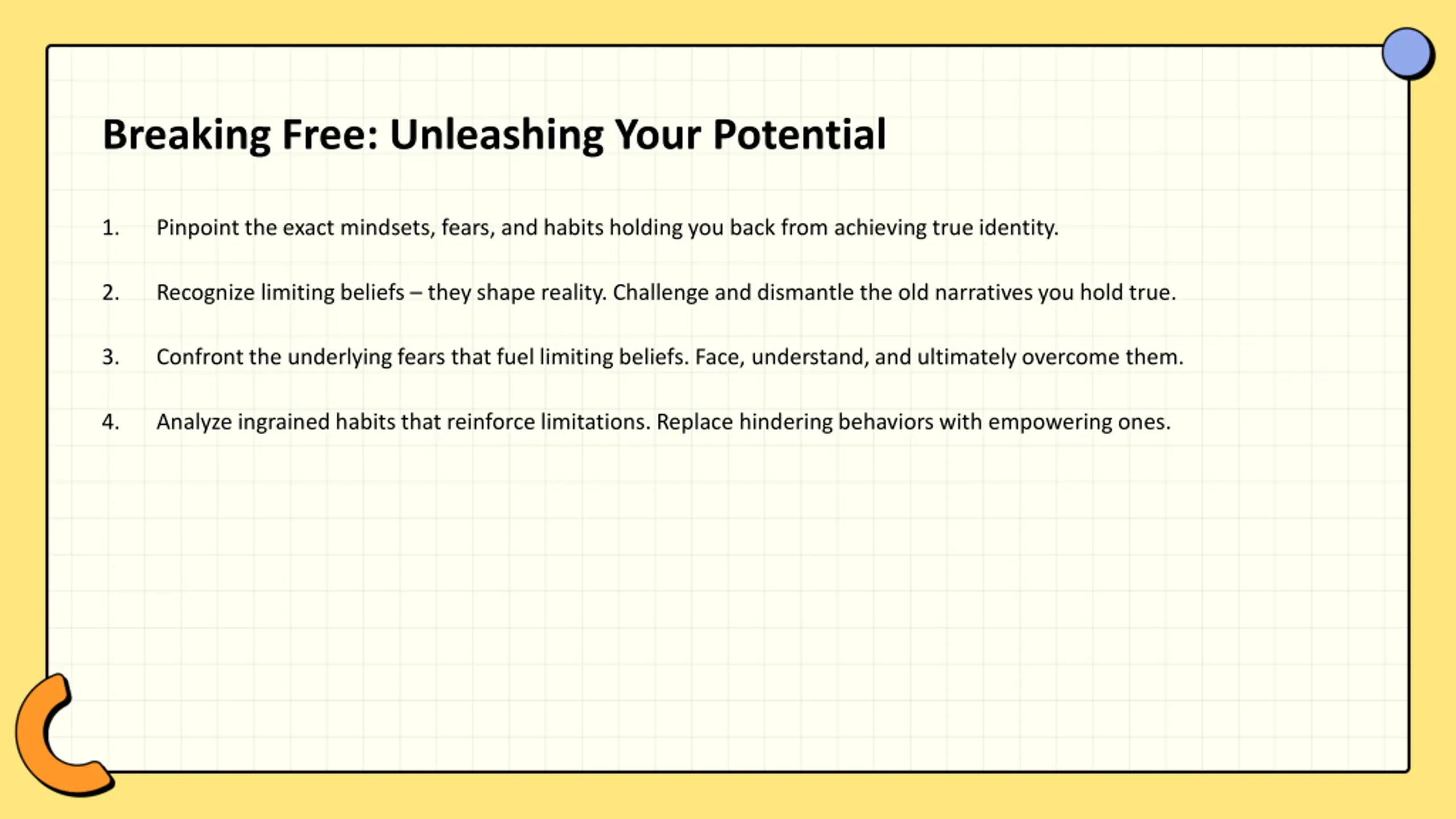 Breaking Free: Unleashing Your Potential 1. Pinpoint the exact mindsets, fears, and habits holding you back from achieving true identity. 2. Recognize limiting beliefs they shape reality. Challenge and dismantle the old narratives you hold true. 3. Confront the underlying fears that fuel limiting beliefs. Face, understand, and ultimately overcome them. 4. Analyze ingrained habits that reinforce limitations. Replace hindering behaviors with empowering ones.
