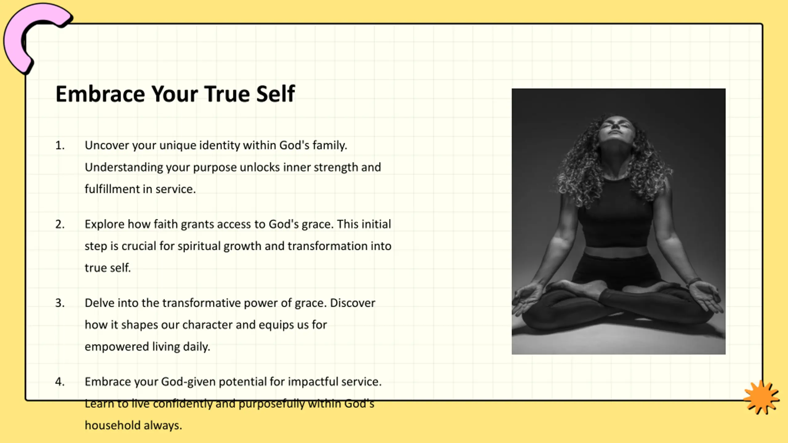Embrace Your True Self 1. Uncover your unique identity within God's family. Understanding your purpose unlocks inner strength and fulfillment in service. 2. Explore how faith grants access to God's grace. This initial step is crucial for spiritual growth and transformation into true self. 3. Delve into the transformative power of grace. Discover how it shapes our character and equips us for empowered living daily. 4. Embrace your God-given potential for impactful service. Learn to live confidently and purposefully within God's household always.