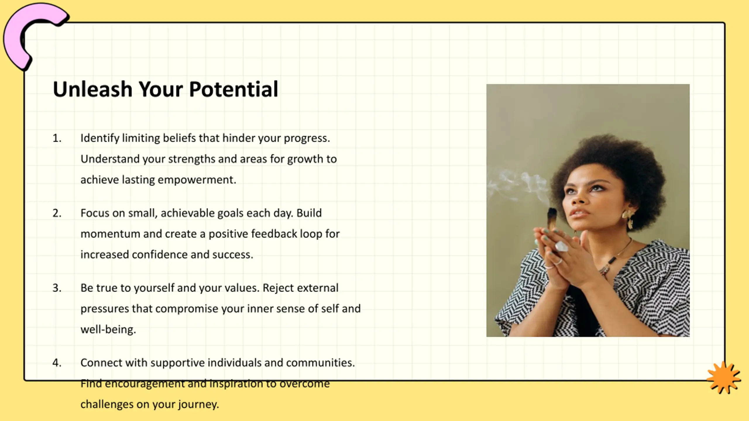Unleash Your Potential 1. Identify limiting beliefs that hinder your progress. Understand your strengths and areas for growth to achieve lasting empowerment. 2. Focus on small, achievable goals each day. Build momentum and create a positive feedback loop for increased confidence and success. 3. Be true to yourself and your values. Reject external pressures that compromise your inner sense of self and well-being. 4. Connect with supportive individuals and communities. Find encouragement and inspiration to overcome challenges on your journey.