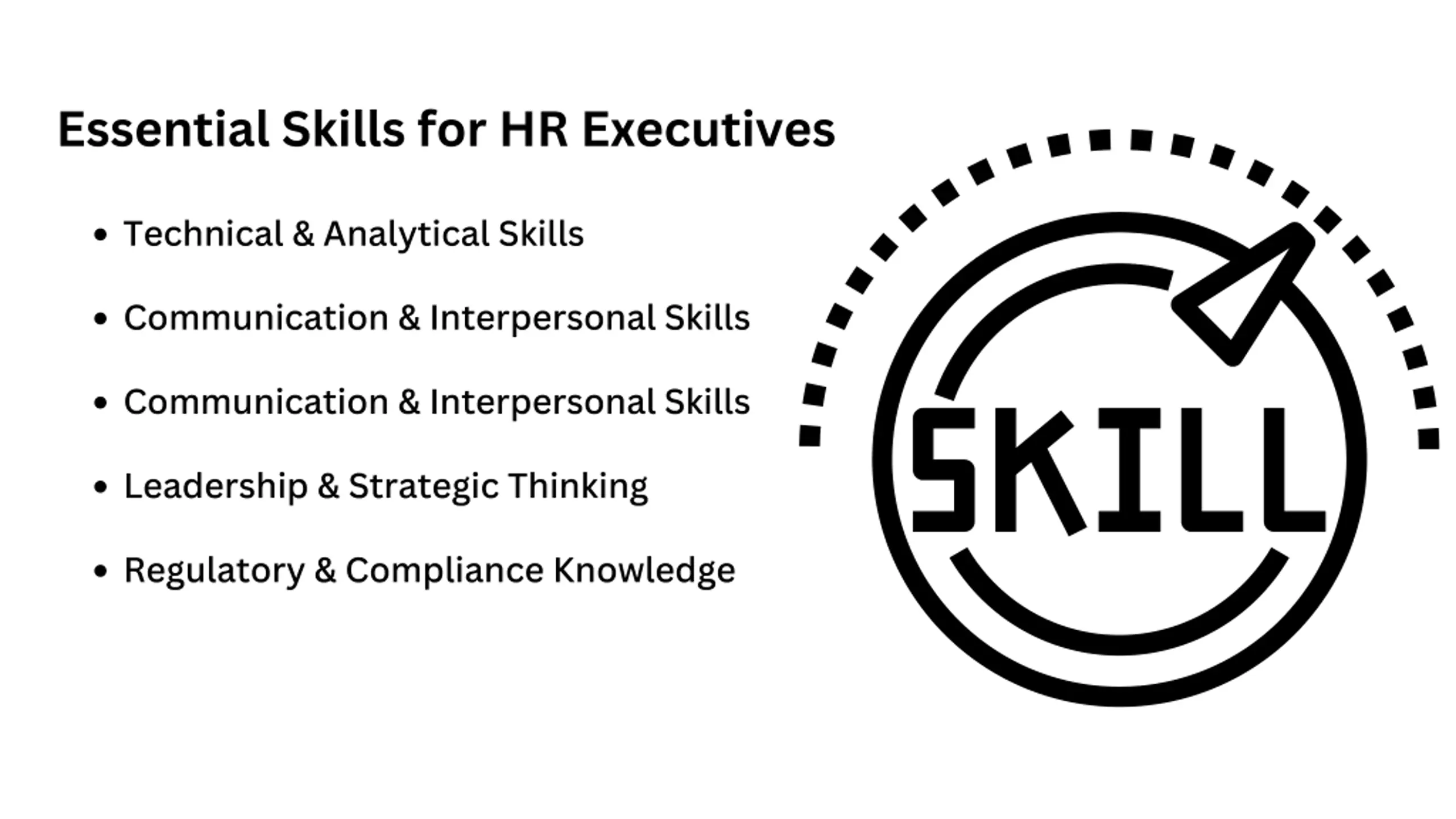 Essential Skills for HR Executives Technical & Analytical Skills Communication & Interpersonal Skills Communication & Interpersonal Skills Leadership & Strategic Thinking Regulatory & Compliance Knowledge