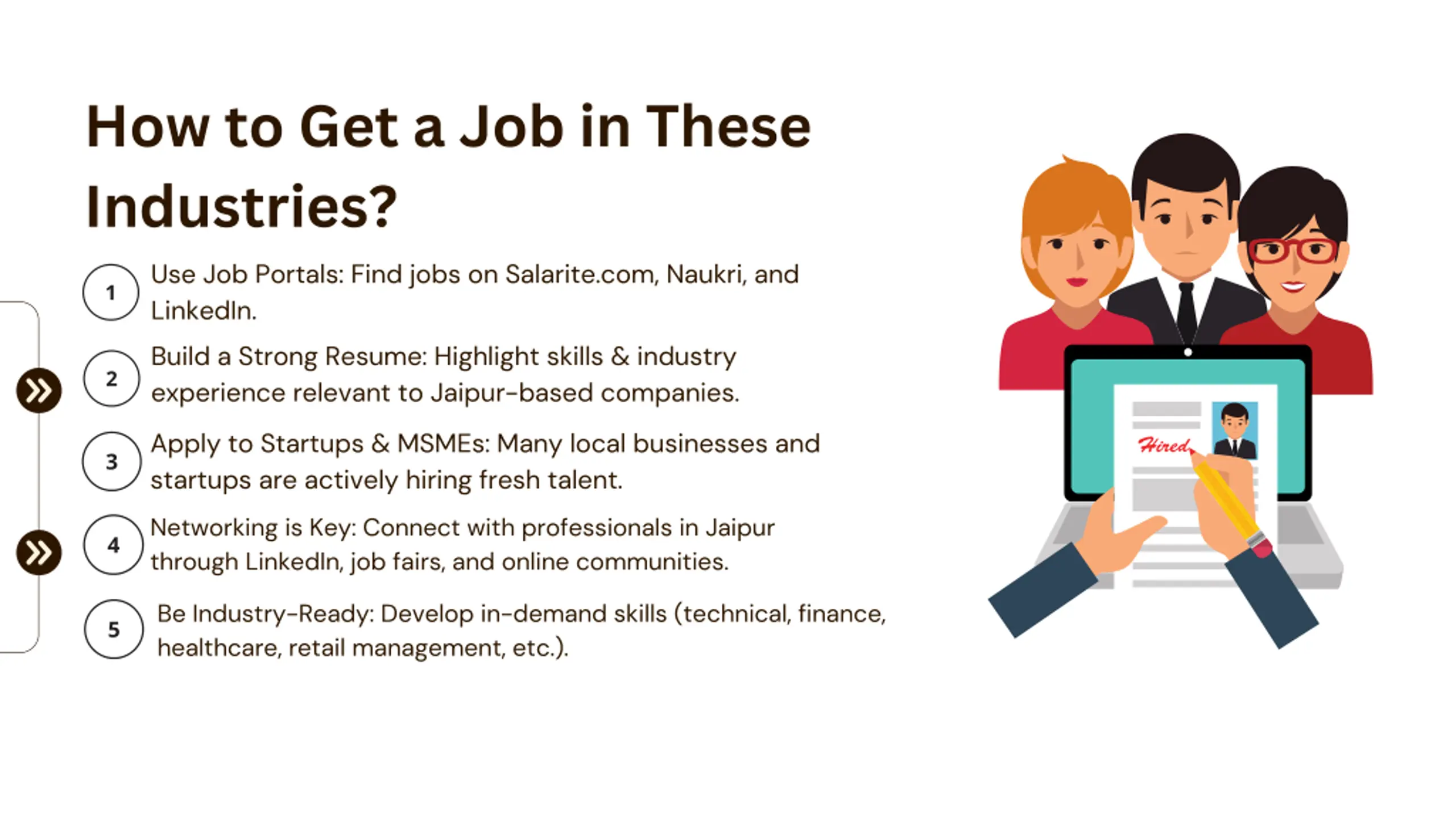 How to Get a Job in These Industries? UseJobPortals: FindjobsonSalarite.com, Naukri, and LinkedIn. BuildaStrongResume: Highlightskills & industry experiencerelevanttoJaipur-basedcompanies. ApplytoStartups & MSMEs: Manylocalbusinessesand startupsareactivelyhiringfreshtalent. NetworkingisKey: ConnectwithprofessionalsinJaipur throughLinkedIn, jobfairs, andonlinecommunities. BeIndustry-Ready: Developin-demandskills (technical, finance, healthcare, retailmanagement, etc.).
