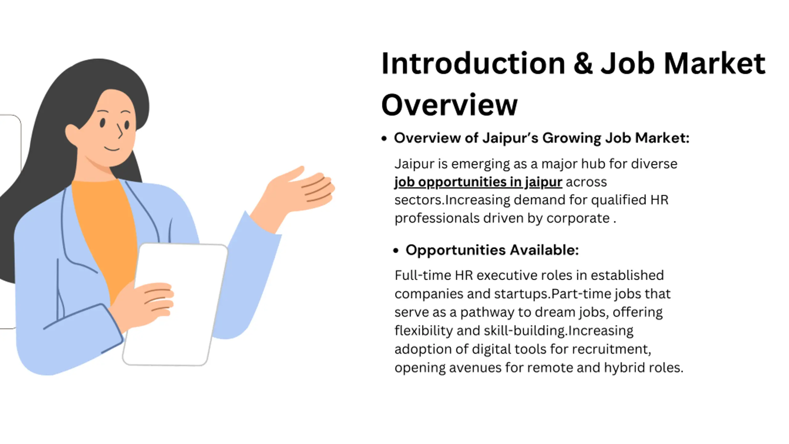 Introduction & Job Market Overview OverviewofJaipur sGrowingJobMarket: Jaipur is emerging as a major hub for diverse job opportunities in jaipur across sectors.Increasing demand for qualified HR professionals driven by corporate . OpportunitiesAvailable: Full-time HR executive roles in established companies and startups.Part-time jobs that serve as a pathway to dream jobs, offering flexibility and skill-building.Increasing adoption of digital tools for recruitment, opening avenues for remote and hybrid roles.