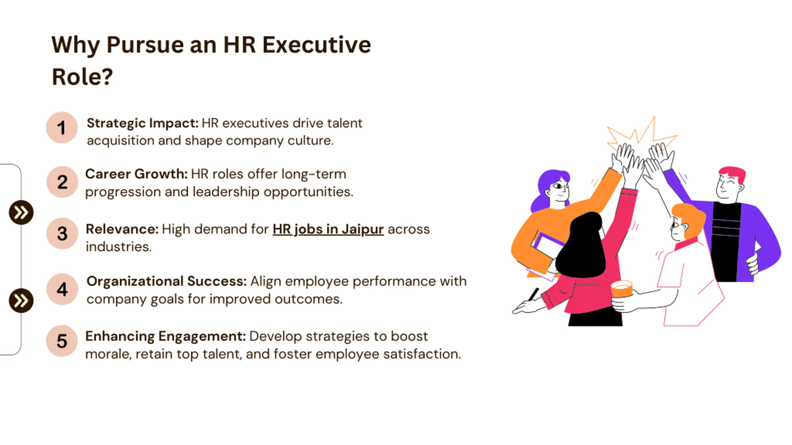 Why Pursue an HR Executive Role? StrategicImpact: HRexecutivesdrivetalent acquisitionandshapecompanyculture. CareerGrowth: HRrolesofferlong-term progressionandleadershipopportunities. Relevance: HighdemandforHRjobsinJaipuracross industries. OrganizationalSuccess: Alignemployeeperformancewith companygoalsforimprovedoutcomes. EnhancingEngagement: Developstrategiestoboost morale, retaintoptalent, andfosteremployeesatisfaction.
