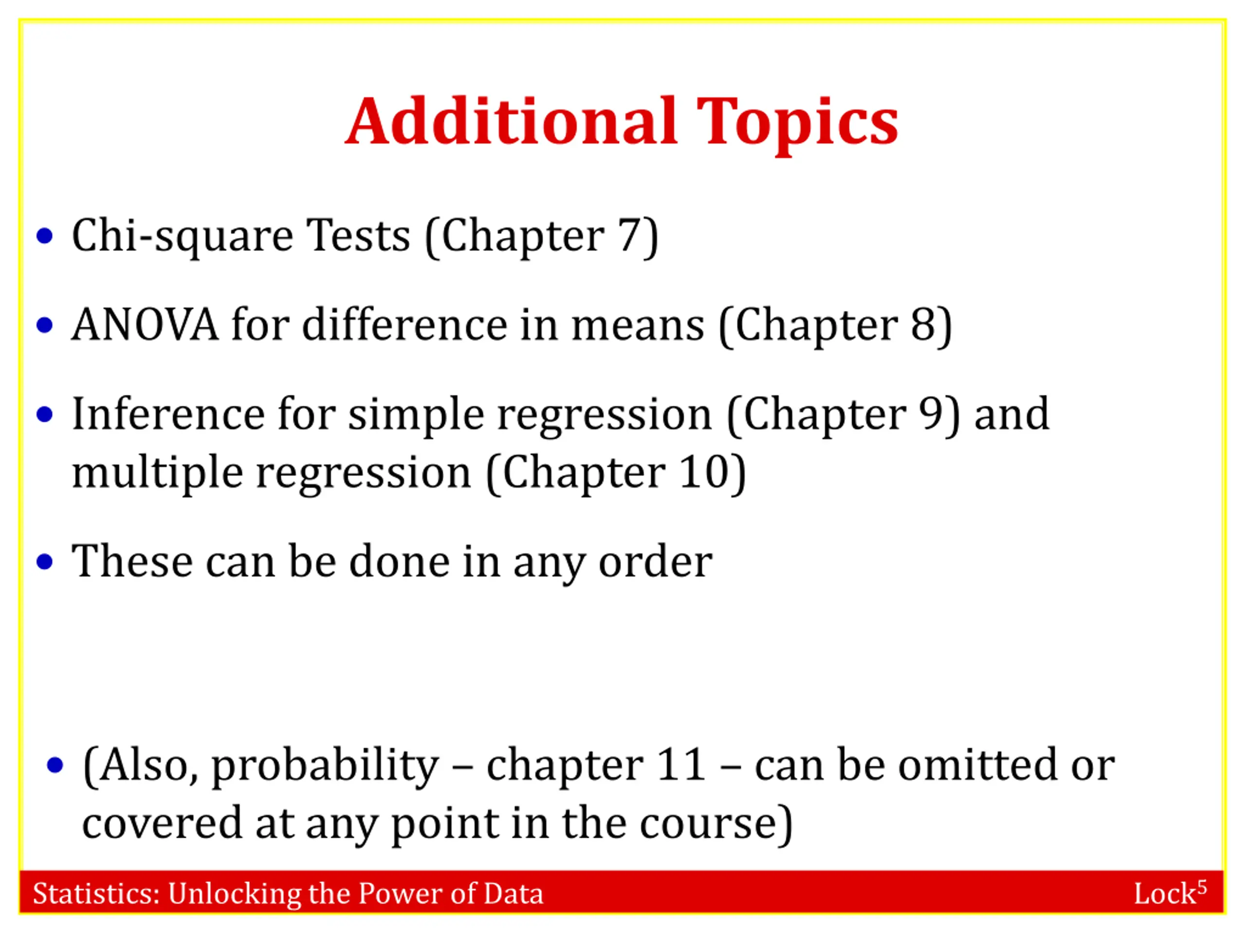 Additional Topics Chi-square Tests (Chapter 7) ANOVA for difference in means (Chapter 8) Inference for simple regression (Chapter 9) and multiple regression (Chapter 10) These can be done in any order (Also, probability chapter 11 can be omitted or covered at any point in the course) Statistics: Unlocking the Power of Data Lock5
