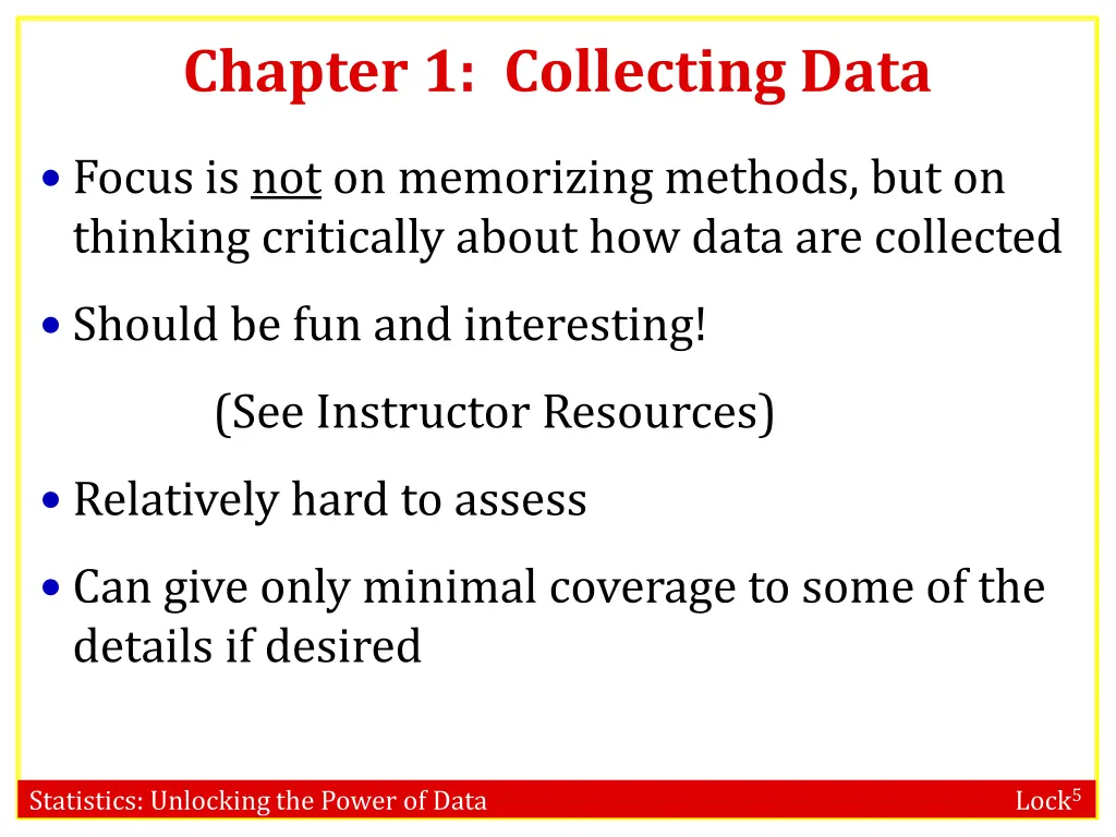 Chapter 1: Collecting Data Focus is not on memorizing methods, but on thinking critically about how data are collected Should be fun and interesting! (See Instructor Resources) Relatively hard to assess Can give only minimal coverage to some of the details if desired Statistics: Unlocking the Power of Data Lock5