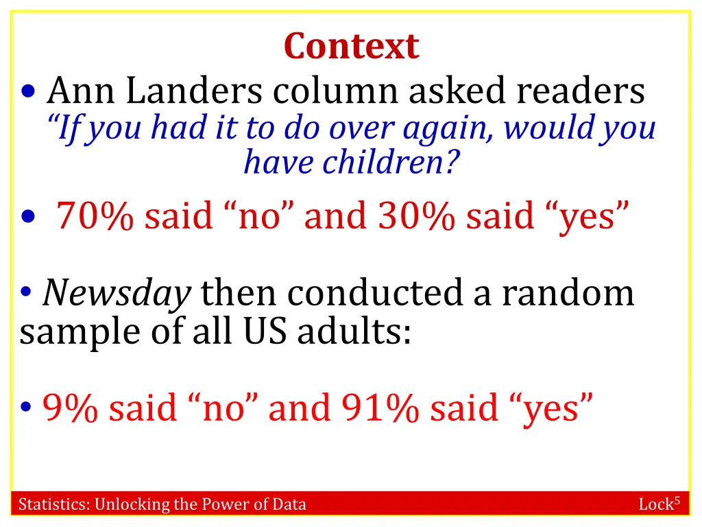 Context Ann Landers column asked readers If you had it to do over again, would you have children? 70% said no and 30% said yes Newsday then conducted a random sample of all US adults: 9% said no and 91% said yes Statistics: Unlocking the Power of Data Lock5