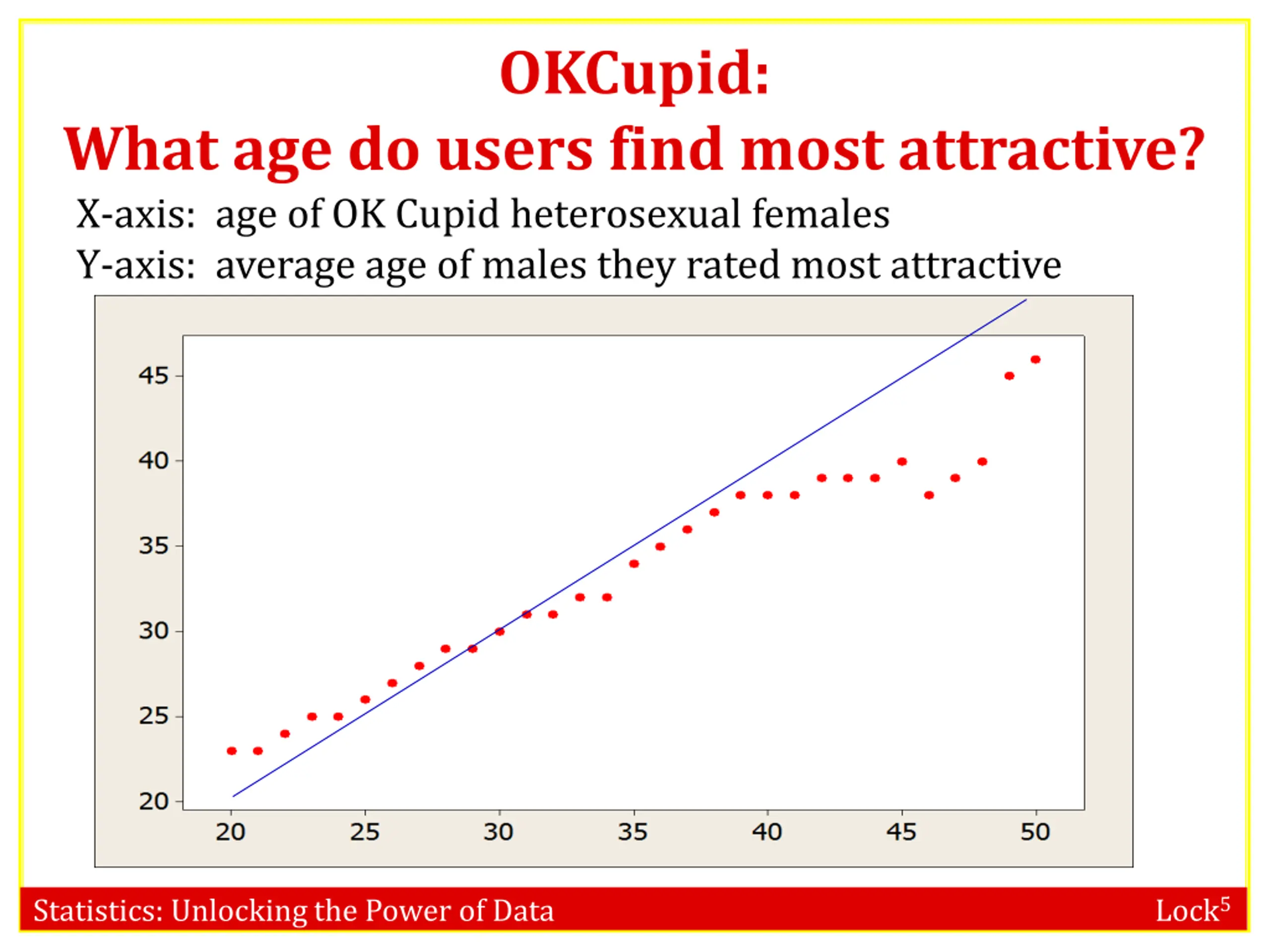OKCupid: What age do users find most attractive? X-axis: age of OK Cupid heterosexual males Y-axis: average age of females they rated most attractive Statistics: Unlocking the Power of Data Lock5