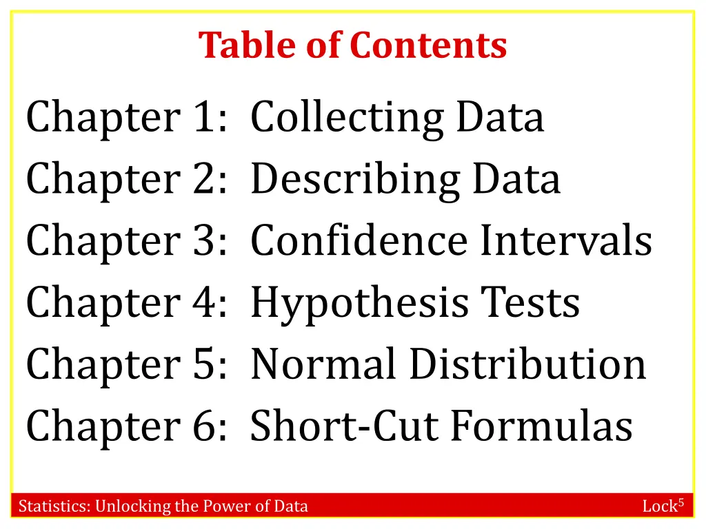 Table of Contents Chapter 1: Collecting Data Chapter 2: Describing Data Chapter 3: Confidence Intervals Chapter 4: Hypothesis Tests Chapter 5: Normal Distribution Chapter 6: Short-Cut Formulas Statistics: Unlocking the Power of Data Lock5