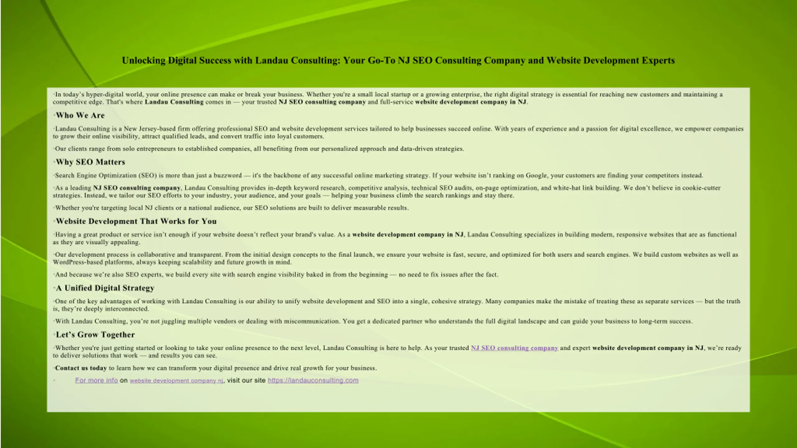 Unlocking Digital Success with Landau Consulting: Your Go-To NJ SEO Consulting Company and Website Development Experts In today s hyper-digital world, your online presence can make or break your business. Whether you're a small local startup or a growing enterprise, the right digital strategy is essential for reaching new customers and maintaining a competitive edge. That's where Landau Consulting comes in your trusted NJ SEO consulting company and full-service website development company in NJ. Who We Are Landau Consulting is a New Jersey-based firm offering professional SEO and website development services tailored to help businesses succeed online. With years of experience and a passion for digital excellence, we empower companies to grow their online visibility, attract qualified leads, and convert traffic into loyal customers. Our clients range from solo entrepreneurs to established companies, all benefiting from our personalized approach and data-driven strategies. Why SEO Matters Search Engine Optimization (SEO) is more than just a buzzword it's the backbone of any successful online marketing strategy. If your website isn t ranking on Google, your customers are finding your competitors instead. As a leading NJ SEO consulting company, Landau Consulting provides in-depth keyword research, competitive analysis, technical SEO audits, on-page optimization, and white-hat link building. We don t believe in cookie-cutter strategies. Instead, we tailor our SEO efforts to your industry, your audience, and your goals helping your business climb the search rankings and stay there. Whether you're targeting local NJ clients or a national audience, our SEO solutions are built to deliver measurable results. Website Development That Works for You Having a great product or service isn t enough if your website doesn t reflect your brand's value. As a website development company in NJ, Landau Consulting specializes in building modern, responsive websites that are as functional as they are visually appealing. Our development process is collaborative and transparent. From the initial design concepts to the final launch, we ensure your website is fast, secure, and optimized for both users and search engines. We build custom websites as well as WordPress-based platforms, always keeping scalability and future growth in mind. And because we re also SEO experts, we build every site with search engine visibility baked in from the beginning no need to fix issues after the fact. A Unified Digital Strategy One of the key advantages of working with Landau Consulting is our ability to unify website development and SEO into a single, cohesive strategy. Many companies make the mistake of treating these as separate services but the truth is, they re deeply interconnected. With Landau Consulting, you re not juggling multiple vendors or dealing with miscommunication. You get a dedicated partner who understands the full digital landscape and can guide your business to long-term success. Let s Grow Together Whether you're just getting started or looking to take your online presence to the next level, Landau Consulting is here to help. As your trusted NJ SEO consulting company and expert website development company in NJ, we re ready to deliver solutions that work and results you can see. Contact us today to learn how we can transform your digital presence and drive real growth for your business. For more info on website development company nj, visit our site https://landauconsulting.com