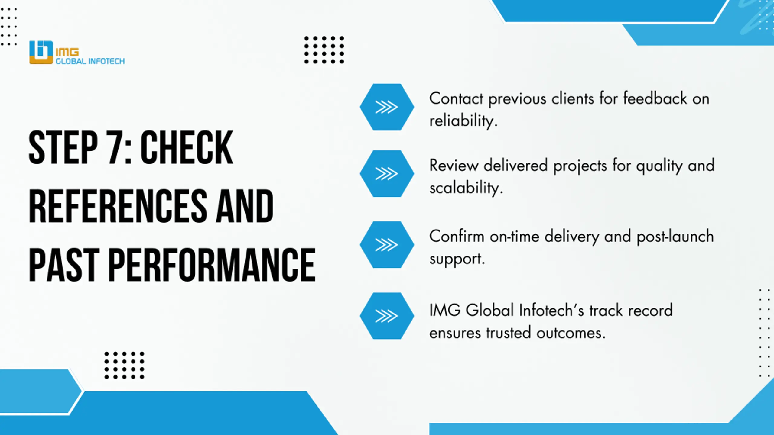 Contact previous clients for feedback on reliability. Step 7: Check References and Past Performance Review delivered projects for quality and scalability. Confirm on-time delivery and post-launch support. IMG Global Infotech s track record ensures trusted outcomes.