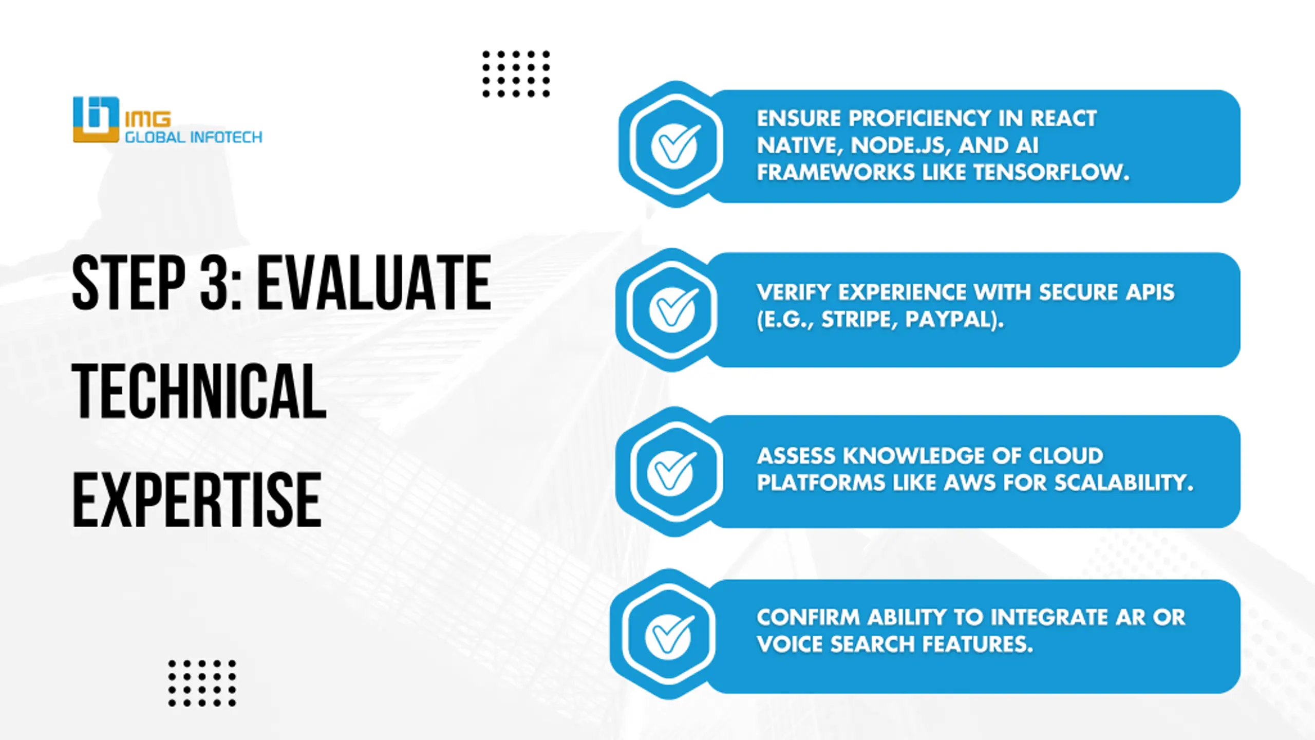 ENSURE PROFICIENCY IN REACT NATIVE, NODE.JS, AND AI FRAMEWORKS LIKE TENSORFLOW. STEP 3: EVALUATE TECHNICAL EXPERTISE VERIFY EXPERIENCE WITH SECURE APIS (E.G., STRIPE, PAYPAL). ASSESS KNOWLEDGE OF CLOUD PLATFORMS LIKE AWS FOR SCALABILITY. CONFIRM ABILITY TO INTEGRATE AR OR VOICE SEARCH FEATURES.