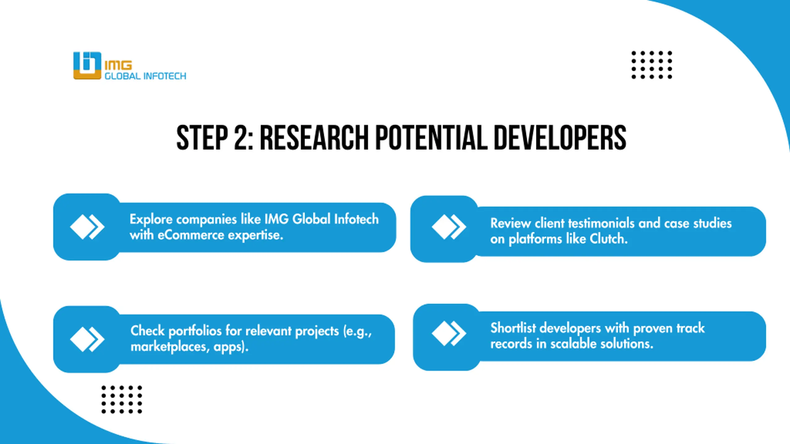 Step 2: Research Potential Developers Explore companies like IMG Global Infotech with eCommerce expertise. Review client testimonials and case studies on platforms like Clutch. Shortlist developers with proven track records in scalable solutions. Check portfolios for relevant projects (e.g., marketplaces, apps).