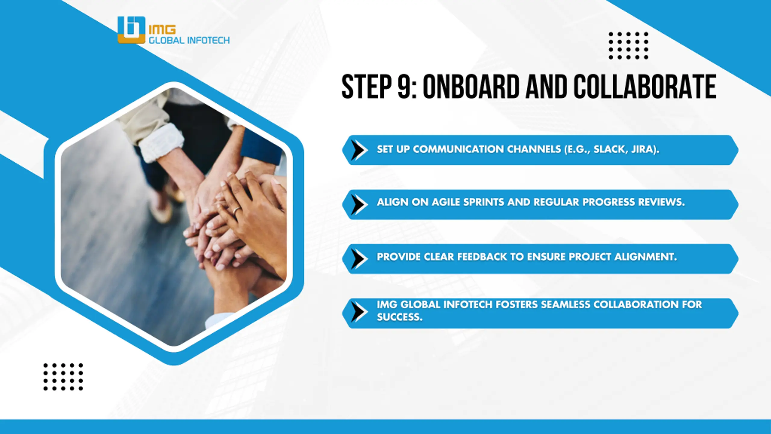 STEP 9: ONBOARD AND COLLABORATE SET UP COMMUNICATION CHANNELS (E.G., SLACK, JIRA). ALIGN ON AGILE SPRINTS AND REGULAR PROGRESS REVIEWS. PROVIDE CLEAR FEEDBACK TO ENSURE PROJECT ALIGNMENT. IMG GLOBAL INFOTECH FOSTERS SEAMLESS COLLABORATION FOR SUCCESS.