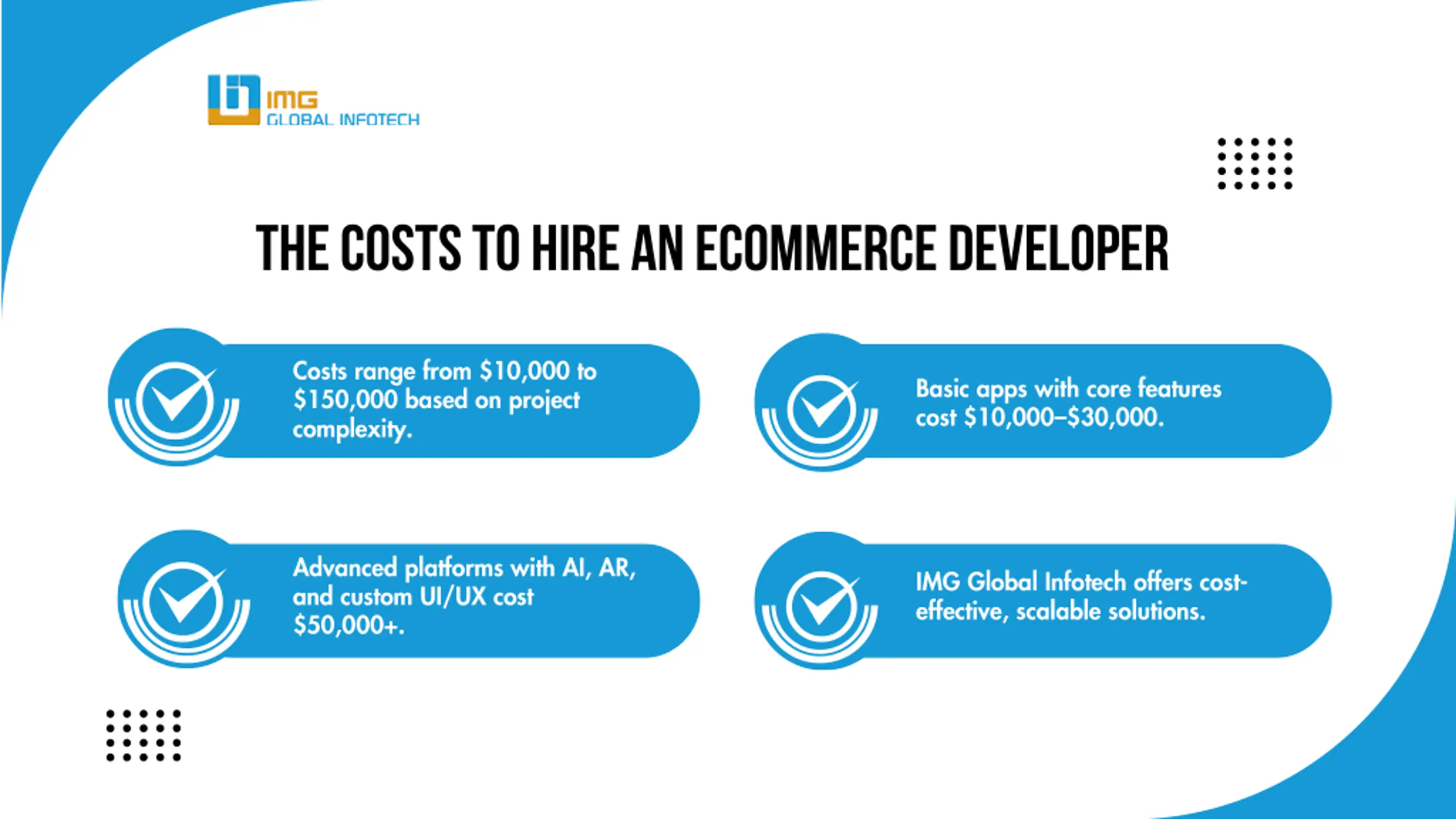 The Costs to Hire an Ecommerce Developer Costs range from $10,000 to $150,000 based on project complexity. Basic apps with core features cost $10,000 $30,000. Advanced platforms with AI, AR, and custom UI/UX cost $50,000+. IMG Global Infotech offers cost- effective, scalable solutions.