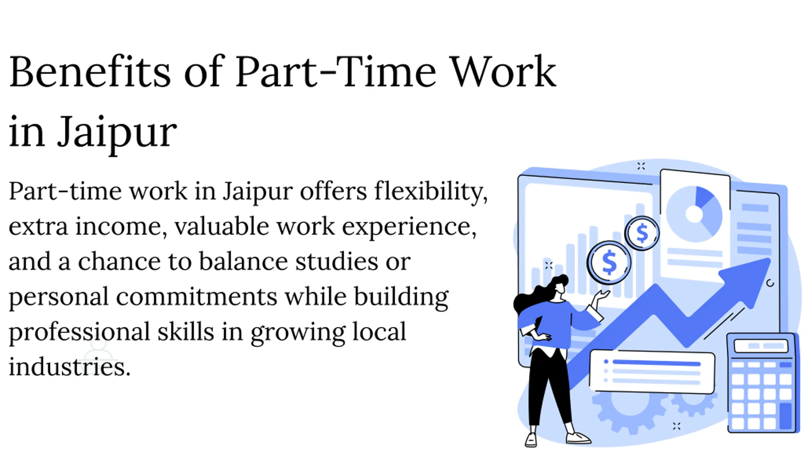 Benefits of Part-Time Work in Jaipur Part-time work in Jaipur offers flexibility, extra income, valuable work experience, and a chance to balance studies or personal commitments while building professional skills in growing local industries.