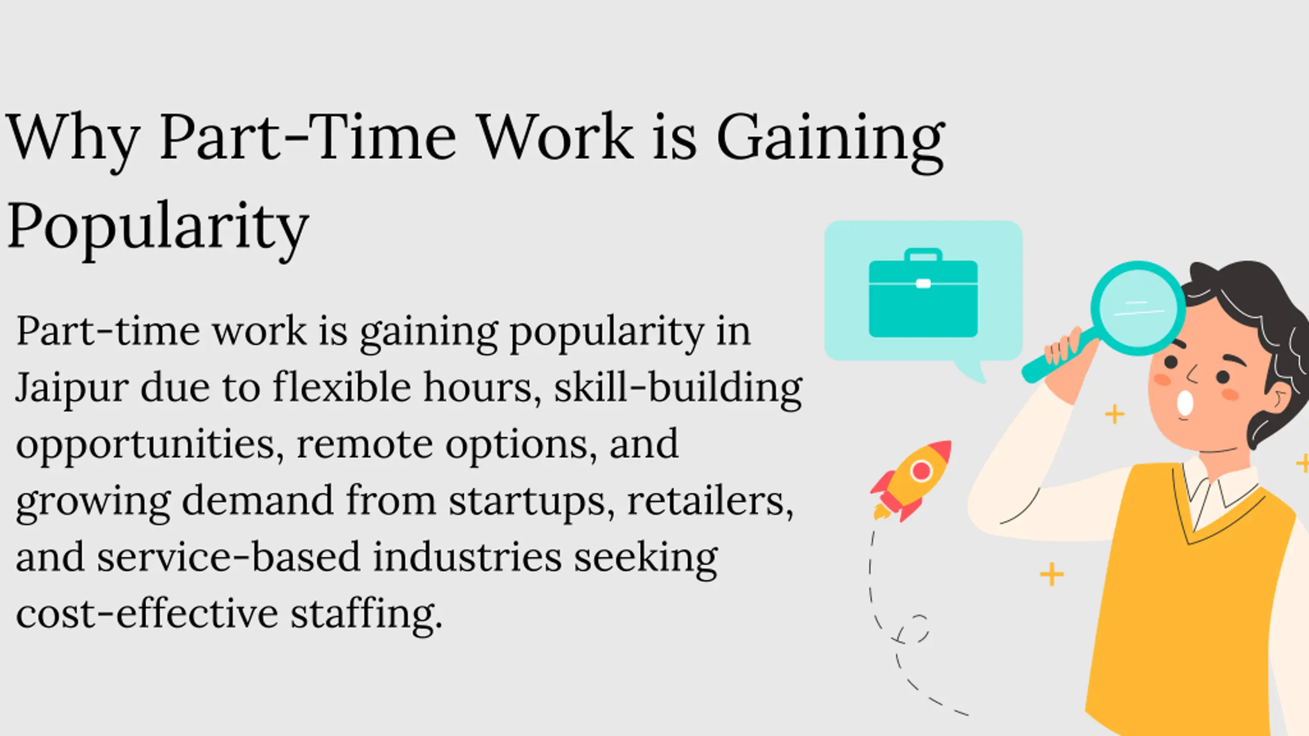 Why Part-Time Work is Gaining Popularity Part-time work is gaining popularity in Jaipur due to flexible hours, skill-building opportunities, remote options, and growing demand from startups, retailers, and service-based industries seeking cost-effective staffing.