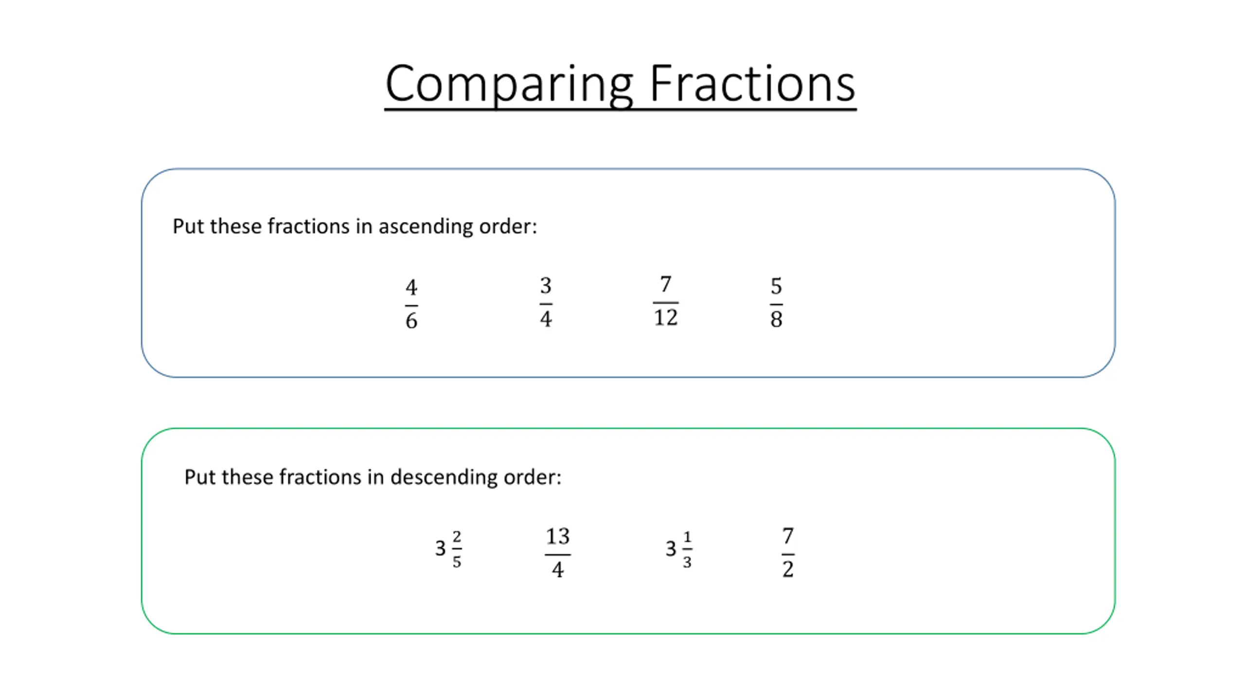 Comparing Fractions Put these fractions in ascending order: 7 3 4 5 8 4 6 12 Put these fractions in descending order: 7 2 13 4 3 2 3 1 5 3