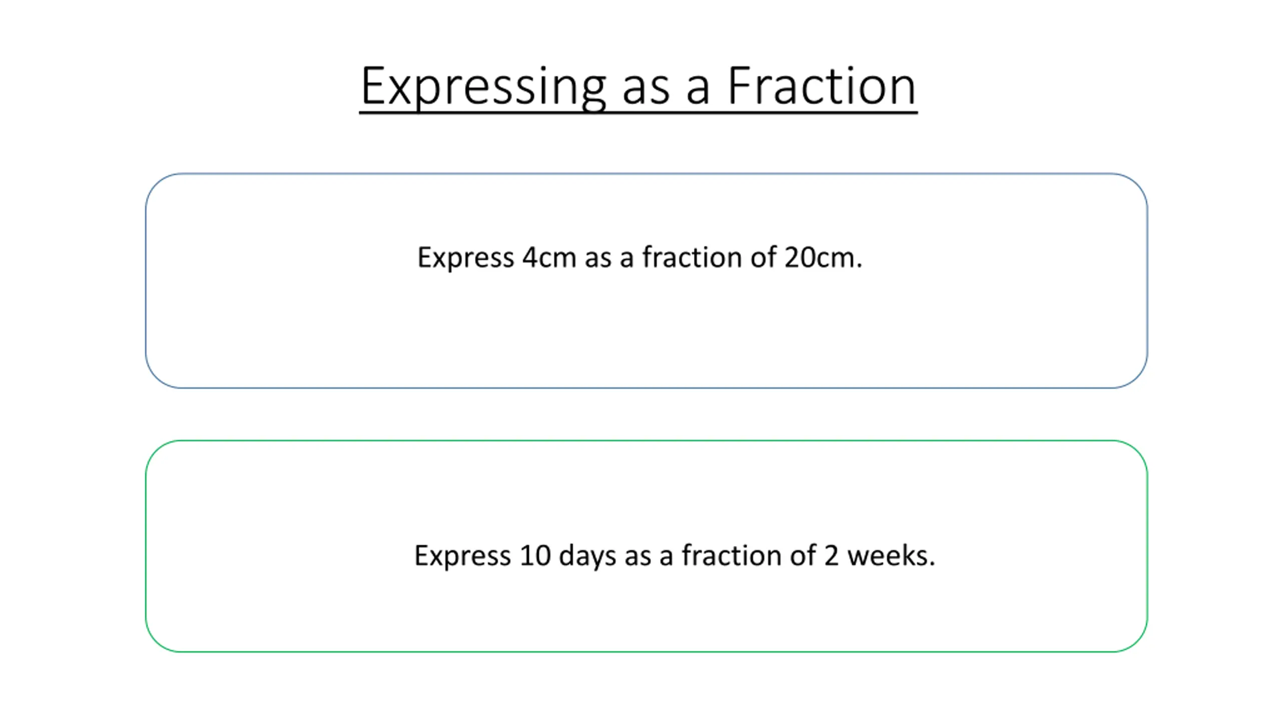Expressing as a Fraction Express 4cm as a fraction of 20cm. Express 10 days as a fraction of 2 weeks.