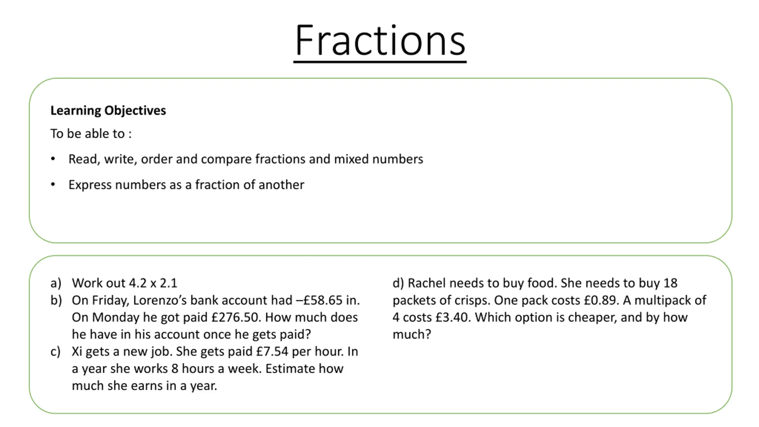 Fractions Learning Objectives To be able to : Read, write, order and compare fractions and mixed numbers Express numbers as a fraction of another a) Work out 4.2 x 2.1 b) On Friday, Lorenzo s bank account had 58.65 in. On Monday he got paid 276.50. How much does he have in his account once he gets paid? c) Xi gets a new job. She gets paid 7.54 per hour. In a year she works 8 hours a week. Estimate how much she earns in a year. d) Rachel needs to buy food. She needs to buy 18 packets of crisps. One pack costs 0.89. A multipack of 4 costs 3.40. Which option is cheaper, and by how much?