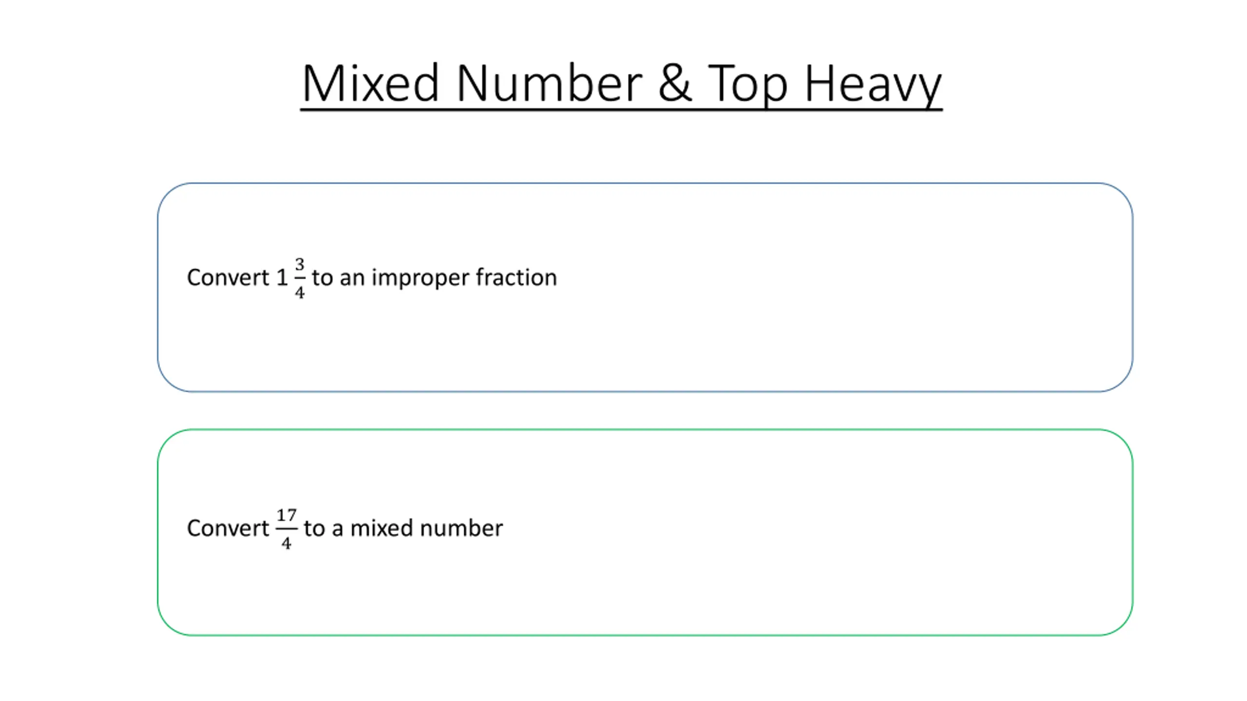 Mixed Number & Top Heavy Convert 1 3 4 to an improper fraction Convert 17 4 to a mixed number