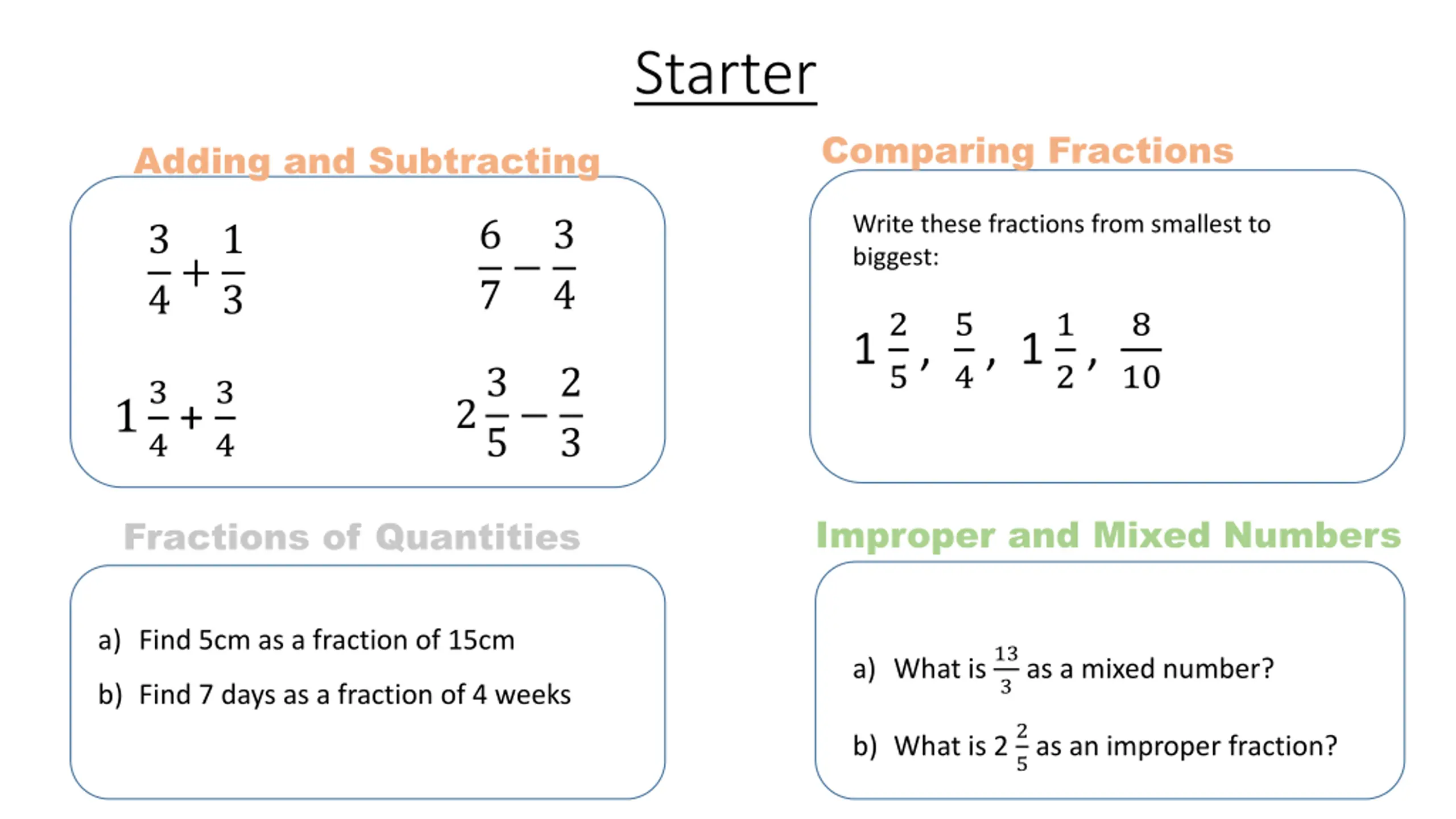 Starter Comparing Fractions Adding and Subtracting Write these fractions from smallest to biggest: 6 7 3 3 4+1 4 3 1 2 5 , 5 4 , 1 1 2 , 8 10 23 5 2 13 4 + 3 4 3 Improper and Mixed Numbers Fractions of Quantities a) Find 5cm as a fraction of 15cm a) What is 13 3 as a mixed number? b) Find 7 days as a fraction of 4 weeks b) What is 2 2 5 as an improper fraction?