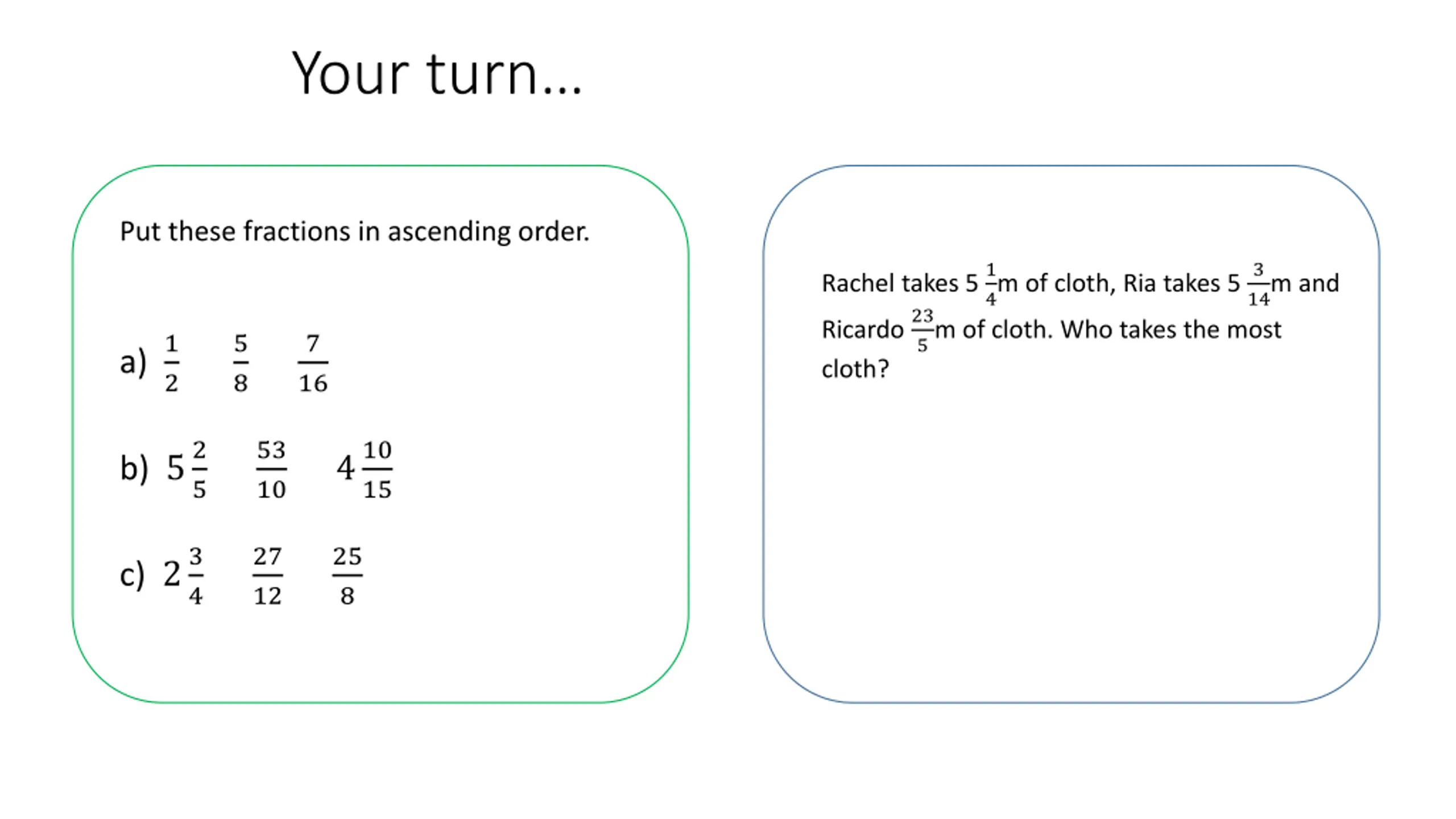 Your turn Put these fractions in ascending order. Rachel takes 5 1 Ricardo 23 cloth? 4m of cloth, Ria takes 5 3 5m of cloth. Who takes the most 14m and a) 1 5 8 7 16 2 b) 52 53 10410 5 15 c) 23 27 12 25 8 4