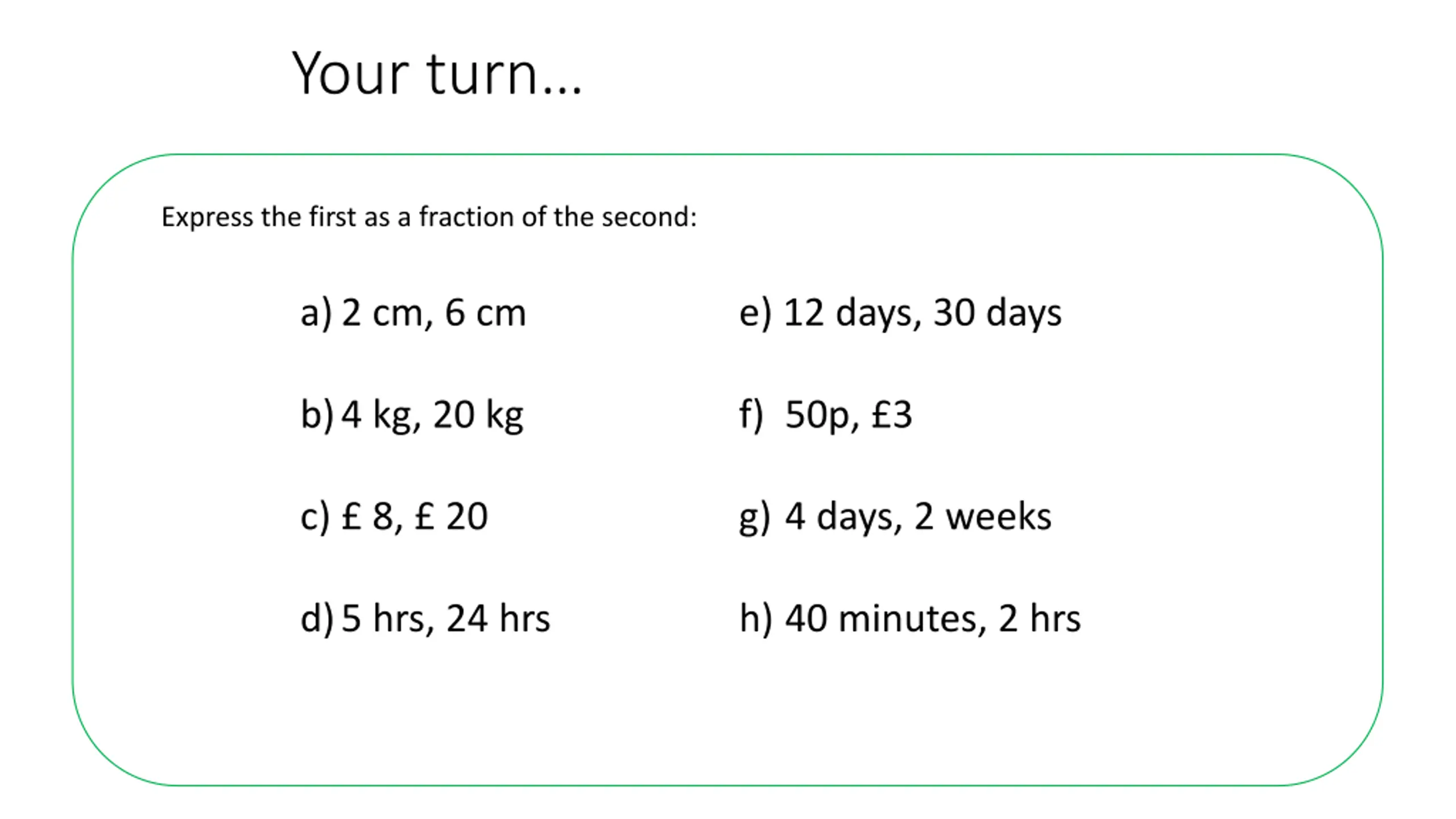 Your turn Express the first as a fraction of the second: a)2 cm, 6 cm e) 12 days, 30 days b)4 kg, 20 kg f) 50p, 3 c) 8, 20 g) 4 days, 2 weeks d)5 hrs, 24 hrs h) 40 minutes, 2 hrs