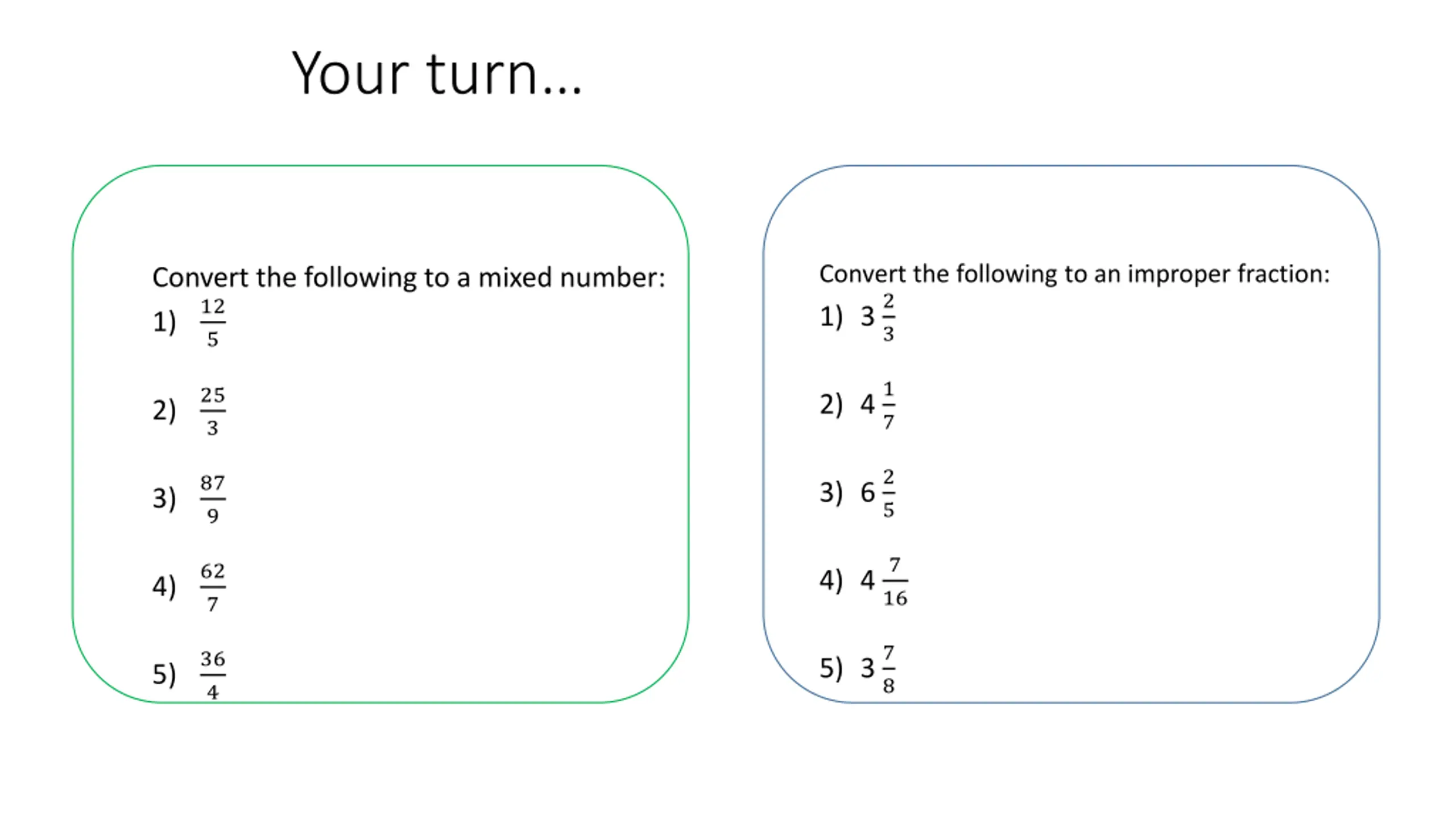 Your turn Convert the following to an improper fraction: 1) 3 2 3 Convert the following to a mixed number: 1) 5 12 2) 4 1 25 3 7 2) 3) 6 2 87 9 5 3) 4) 4 7 62 7 4) 16 5) 3 7 36 4 5) 8