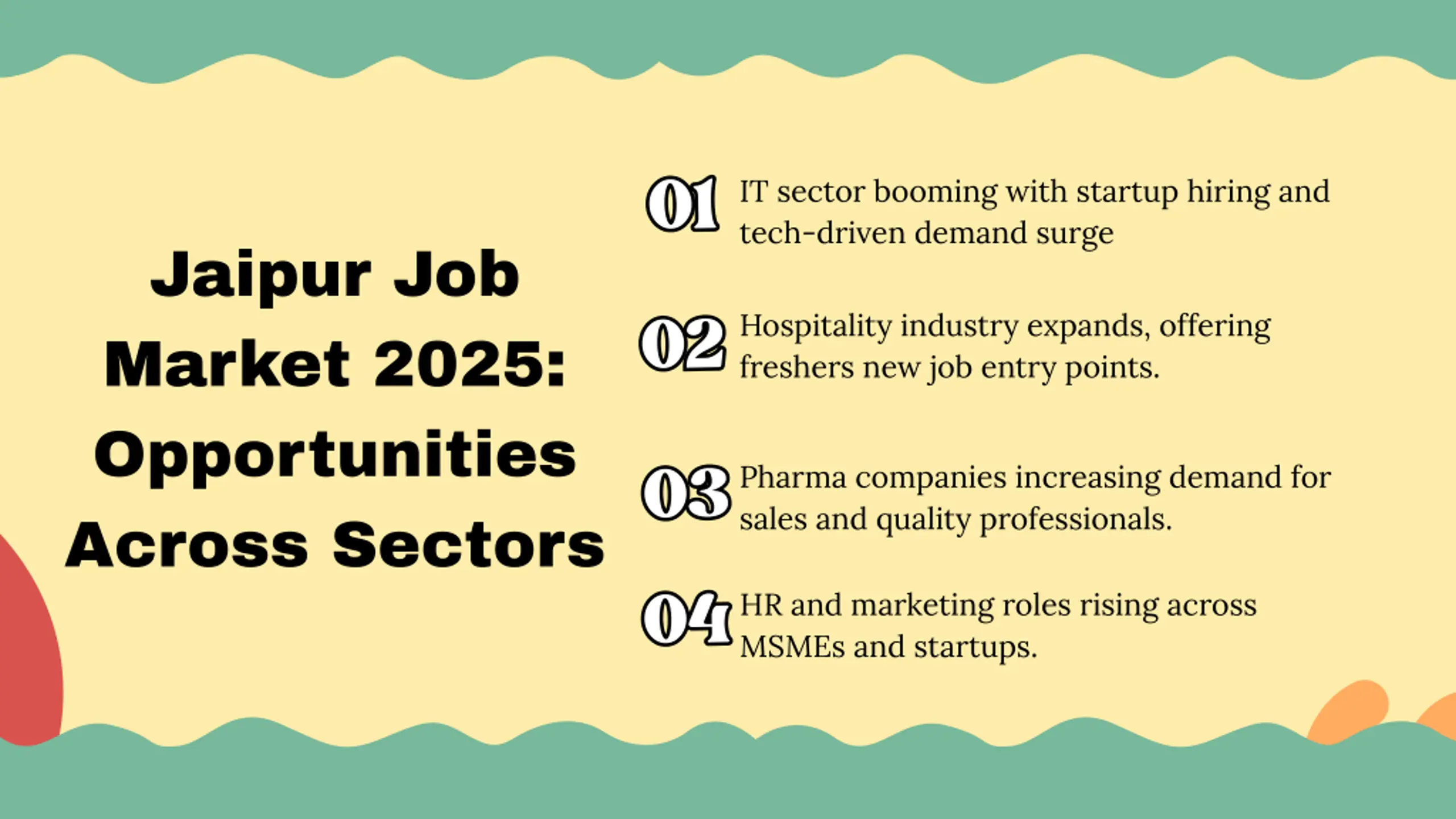 01 01 02 02 IT sector booming with startup hiring and tech-driven demand surge Jaipur Job Market 2025: Opportunities Across Sectors Hospitality industry expands, offering freshers new job entry points. 03 03 04 04 Pharma companies increasing demand for sales and quality professionals. HR and marketing roles rising across MSMEs and startups.