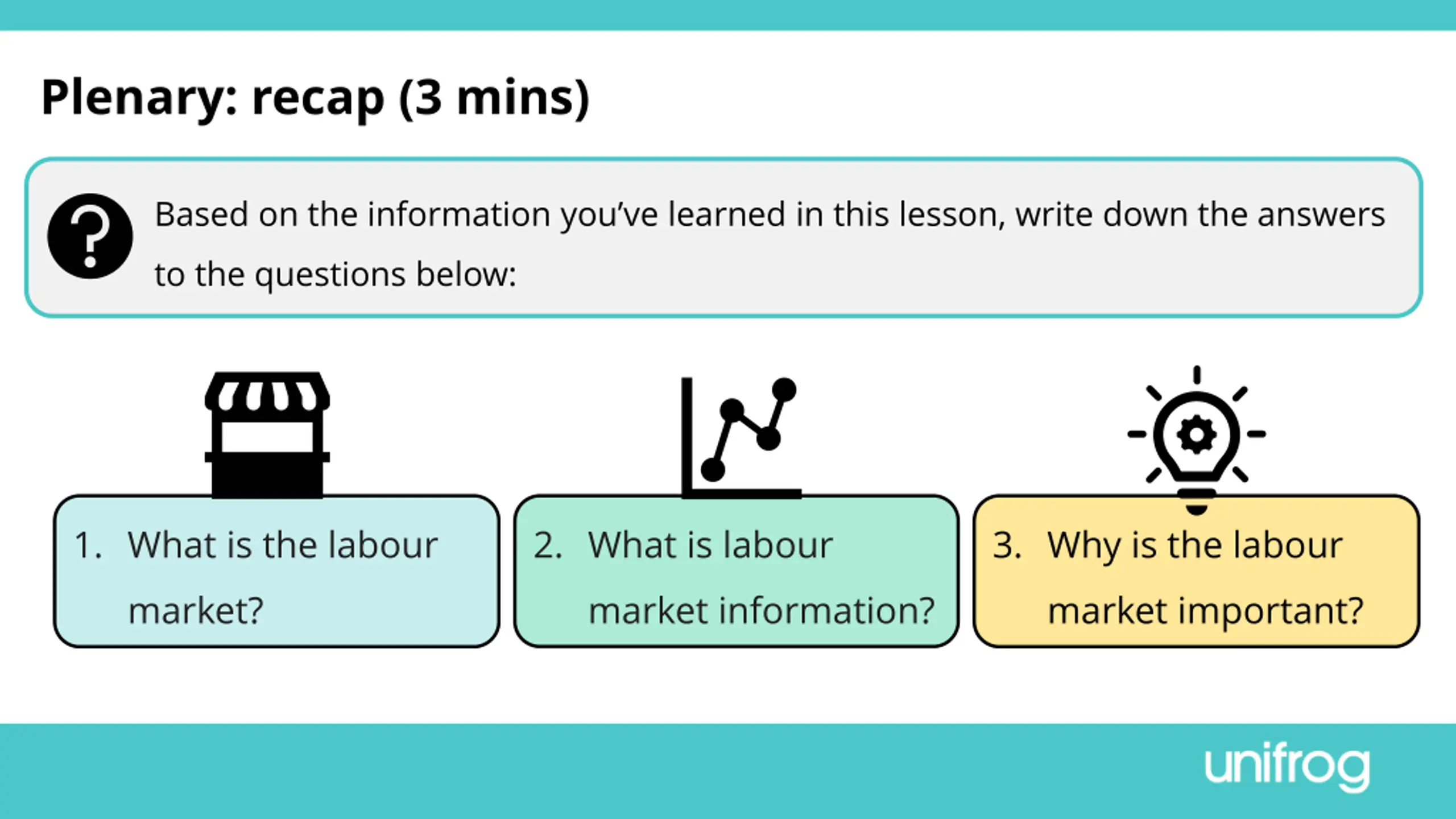 Plenary: recap (3 mins) Based on the information you ve learned in this lesson, write down the answers to the questions below: 2. What is labour market information? 1. What is the labour market? 3. Why is the labour market important?