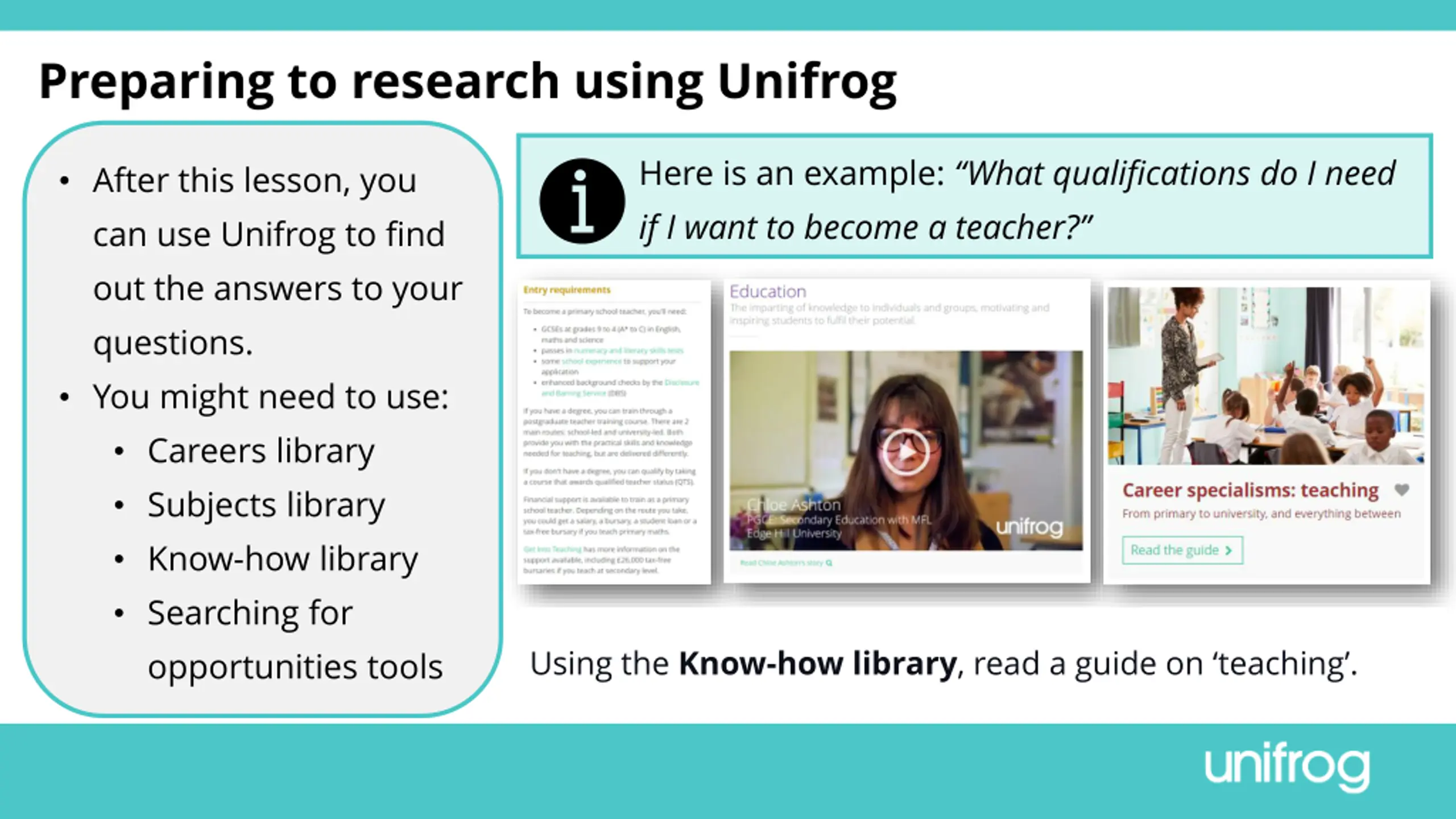 Preparing to research using Unifrog Here is an example: What qualifications do I need if I want to become a teacher? After this lesson, you can use Unifrog to find out the answers to your questions. You might need to use: Careers library Subjects library Know-how library Searching for opportunities tools In the Subjects library, find Education and read about Using the Know-how library, read a guide on teaching . On the Careers library profile, scroll to Entry requirements . studying it as a degree.
