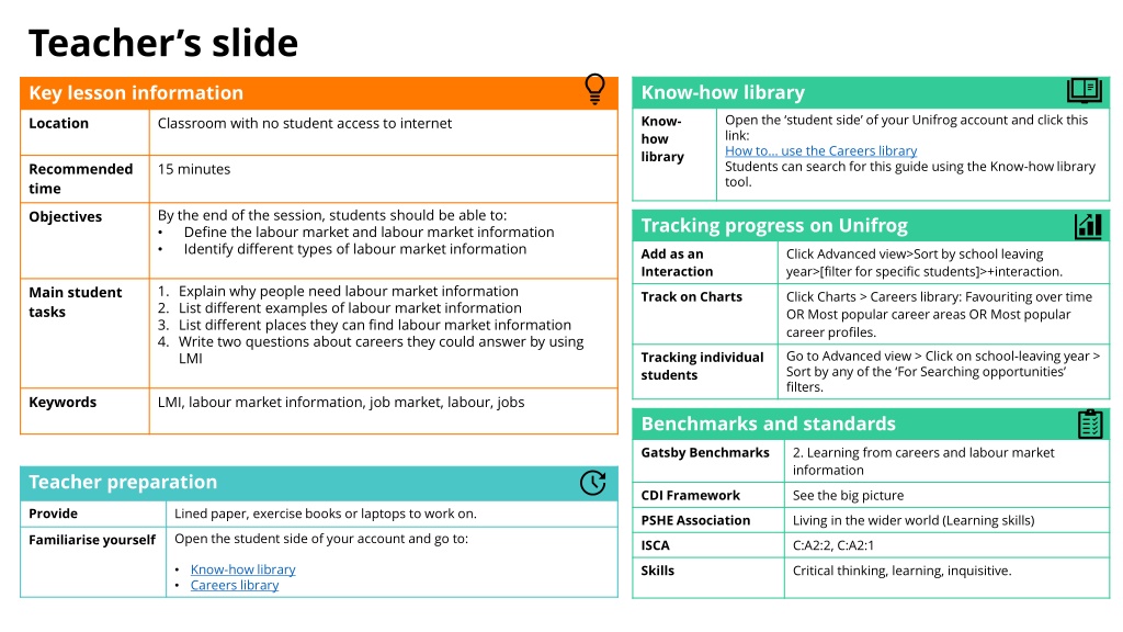 Teachers slide Know-how library Key lesson information Open the student side of your Unifrog account and click this link: How to use the Careers library Students can search for this guide using the Know-how library tool. Know- how library Location Classroom with no student access to internet Recommended time 15 minutes By the end of the session, students should be able to: Define the labour market and labour market information Identify different types of labour market information Objectives Tracking progress on Unifrog Add as an Interaction Click Advanced view>Sort by school leaving year>[filter for specific students]>+interaction. 1. Explain why people need labour market information 2. List different examples of labour market information 3. List different places they can find labour market information 4. Write two questions about careers they could answer by using LMI Main student tasks Track on Charts Click Charts > Careers library: Favouriting over time OR Most popular career areas OR Most popular career profiles. Go to Advanced view > Click on school-leaving year > Sort by any of the For Searching opportunities filters. Tracking individual students Keywords LMI, labour market information, job market, labour, jobs Benchmarks and standards Gatsby Benchmarks 2. Learning from careers and labour market information Teacher preparation CDI Framework See the big picture Provide Lined paper, exercise books or laptops to work on. PSHE Association Living in the wider world (Learning skills) Open the student side of your account and go to: Familiarise yourself ISCA C:A2:2, C:A2:1 Know-how library Careers library Skills Critical thinking, learning, inquisitive.