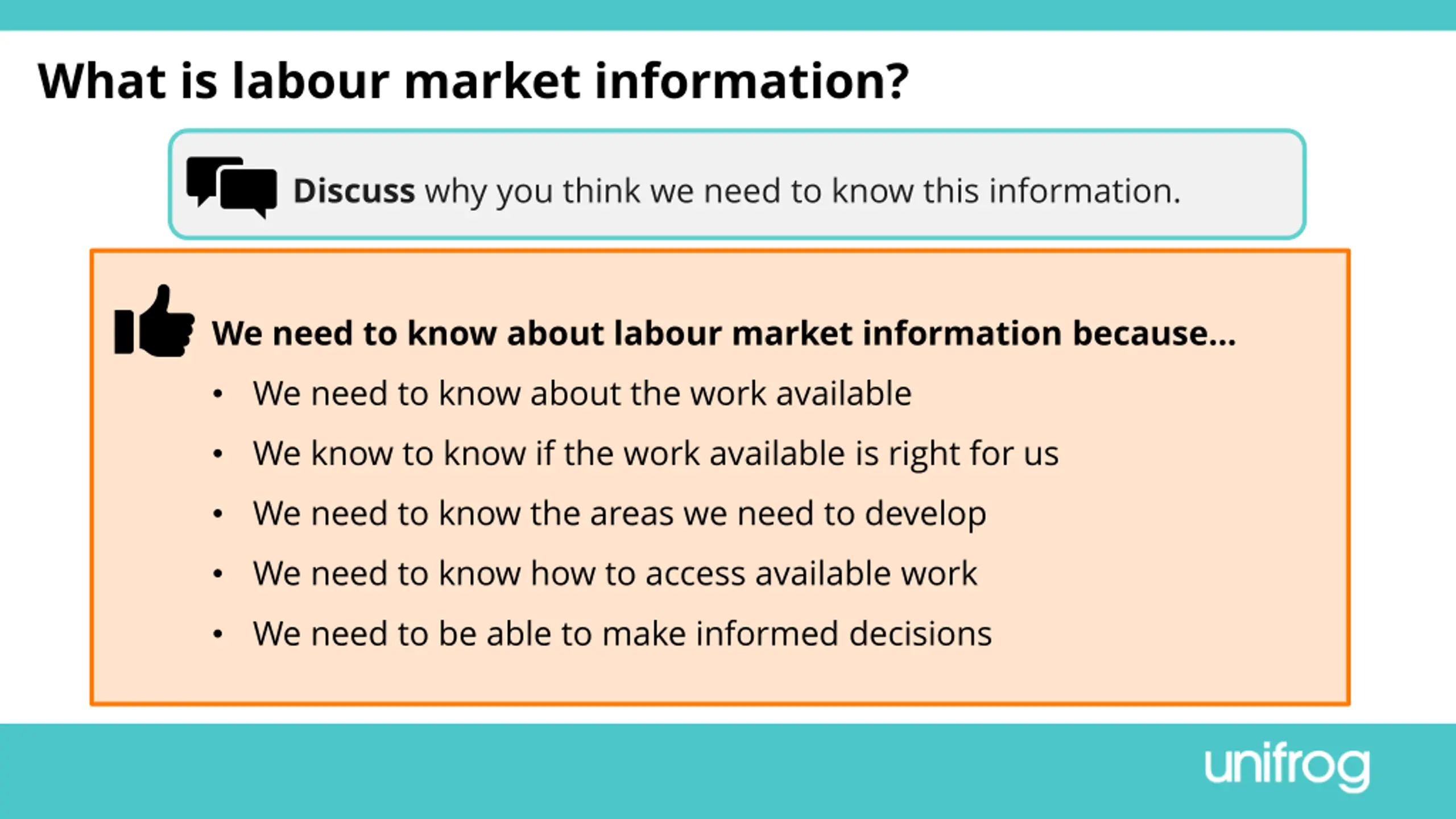 What is labour market information? Discuss why you think we need to know this information. We need to know about labour market information because We need to know about the work available We know to know if the work available is right for us We need to know the areas we need to develop We need to know how to access available work We need to be able to make informed decisions