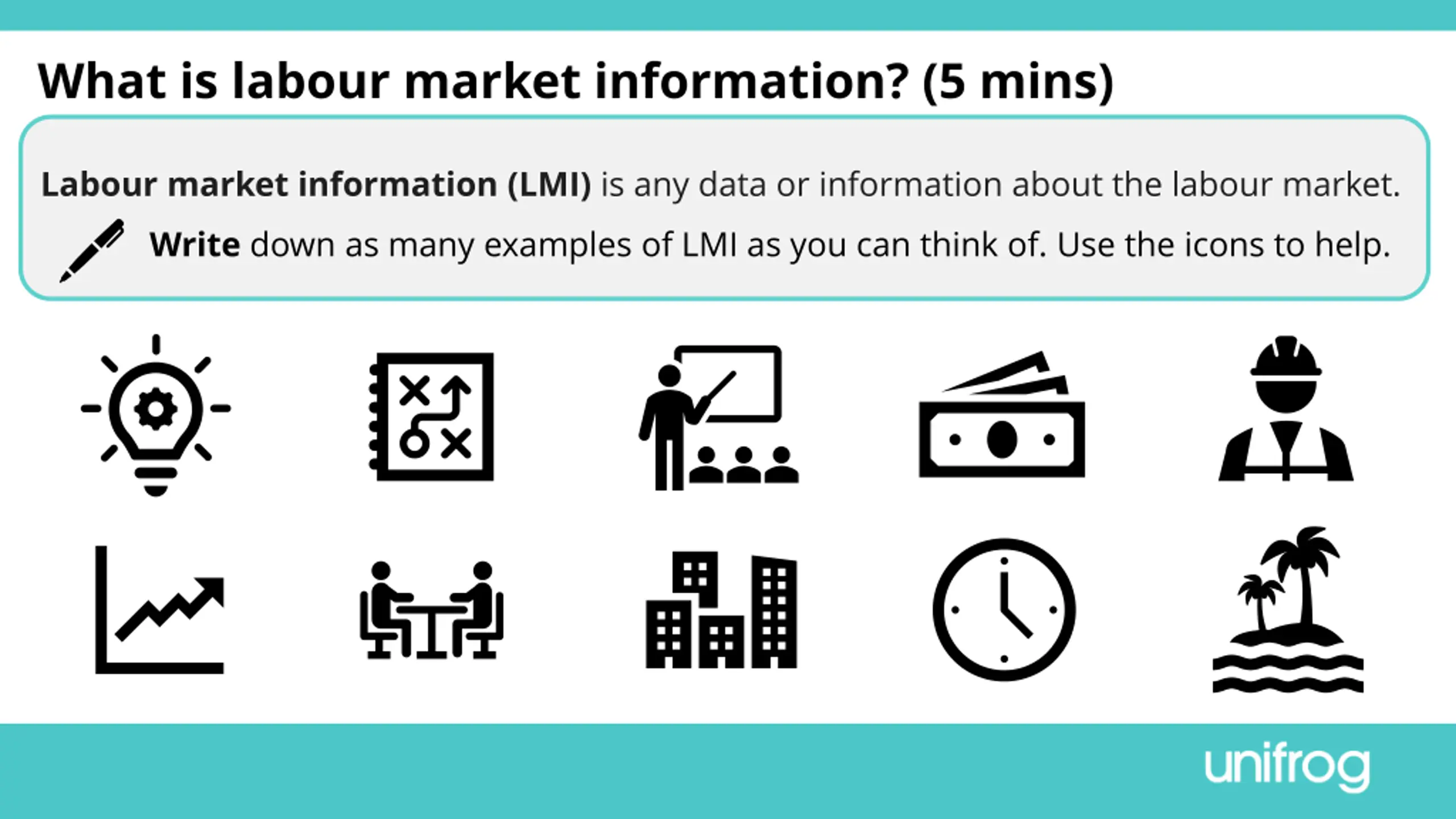 What is labour market information? (5 mins) Labour market information (LMI) is any data or information about the labour market. Write down as many examples of LMI as you can think of. Use the icons to help.