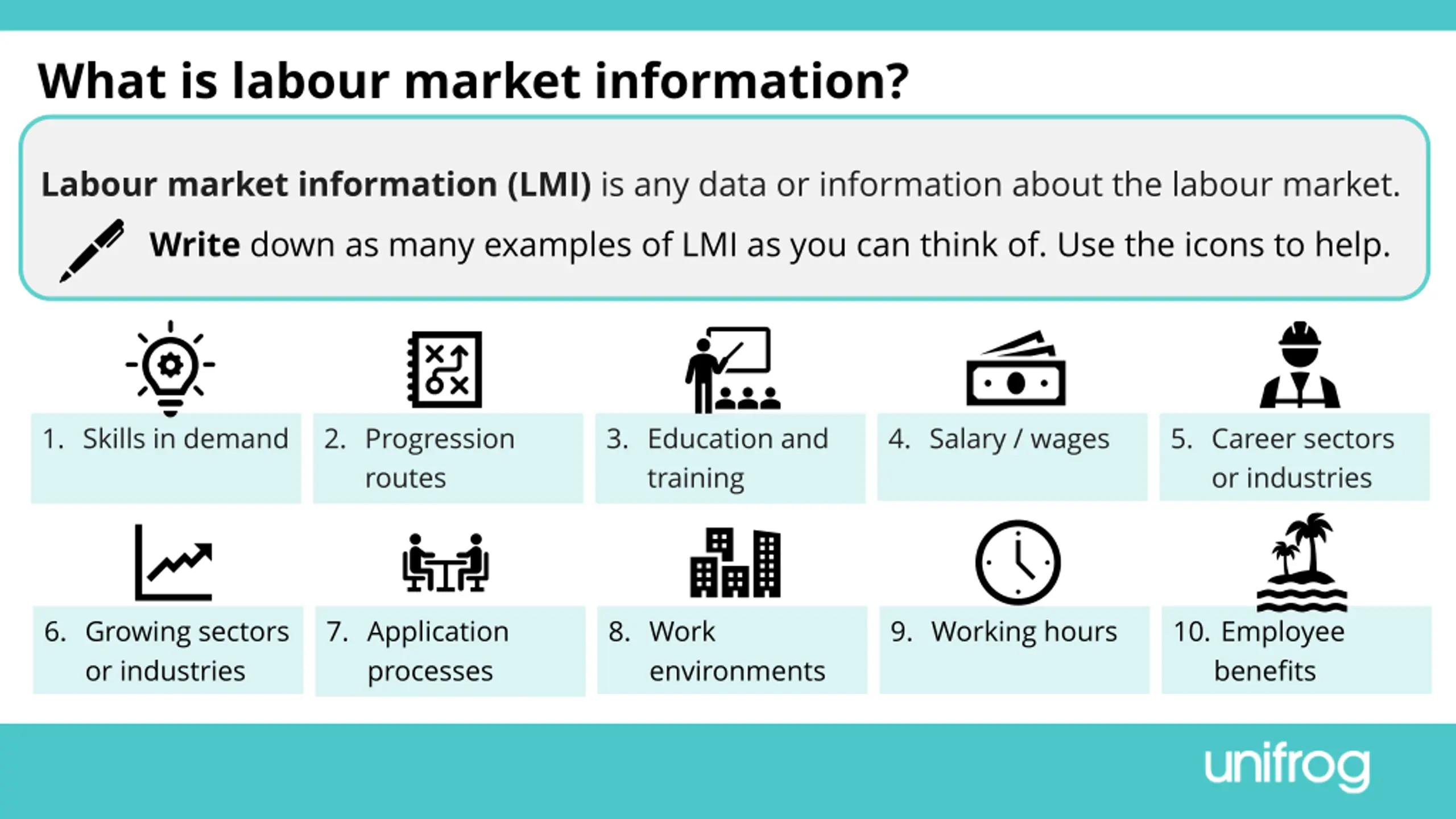 What is labour market information? Labour market information (LMI) is any data or information about the labour market. Write down as many examples of LMI as you can think of. Use the icons to help. 1. Skills in demand 2. Progression routes 3. Education and training 4. Salary / wages 5. Career sectors or industries 6. Growing sectors or industries 7. Application processes 8. Work environments 9. Working hours 10. Employee benefits