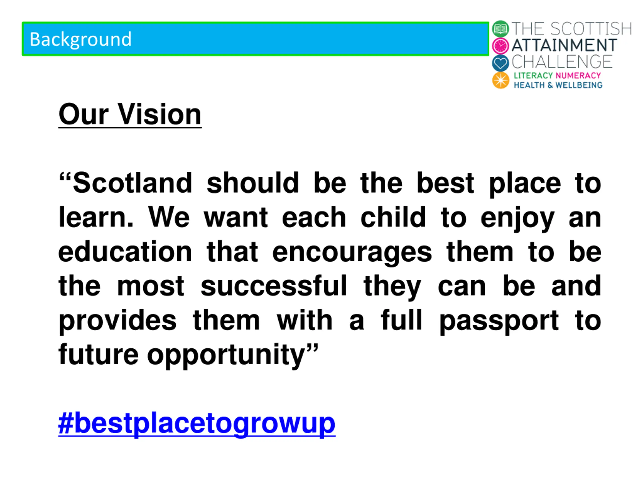 Background Our Vision Scotland should be the best place to learn. We want each child to enjoy an education that encourages them to be the most successful they can be and provides them with a full passport to future opportunity #bestplacetogrowup