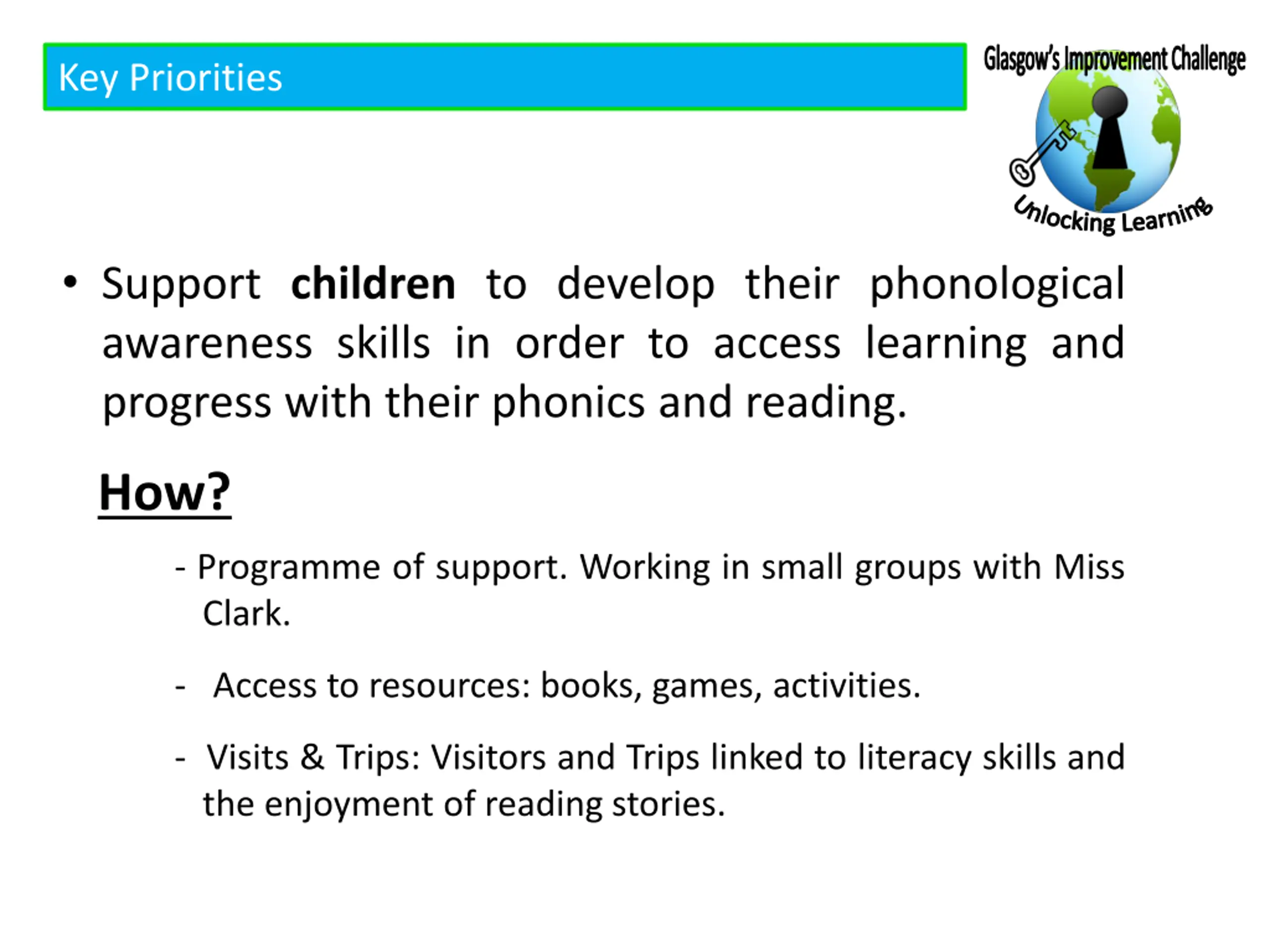 Glasgows Improvement Challenge Key Priorities Unlocking Learning Support children to develop their phonological awareness skills in order to access learning and progress with their phonics and reading. How? - Programme of support. Working in small groups with Miss Clark. - Access to resources: books, games, activities. - Visits & Trips: Visitors and Trips linked to literacy skills and the enjoyment of reading stories.