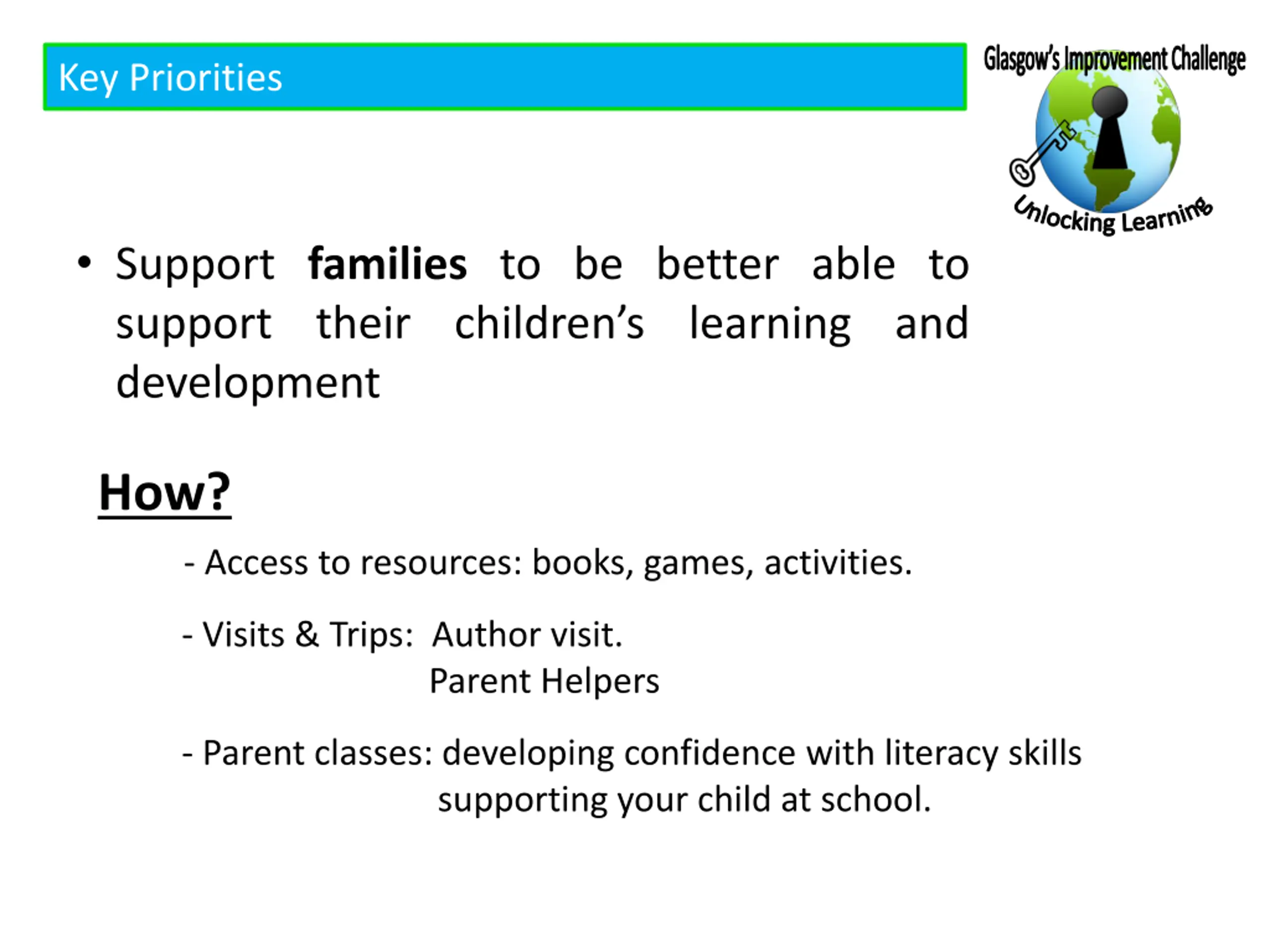 Glasgows Improvement Challenge Key Priorities Unlocking Learning Support families to be better able to support their children s learning and development How? - Access to resources: books, games, activities. - Visits & Trips: Author visit. Parent Helpers - Parent classes: developing confidence with literacy skills supporting your child at school.