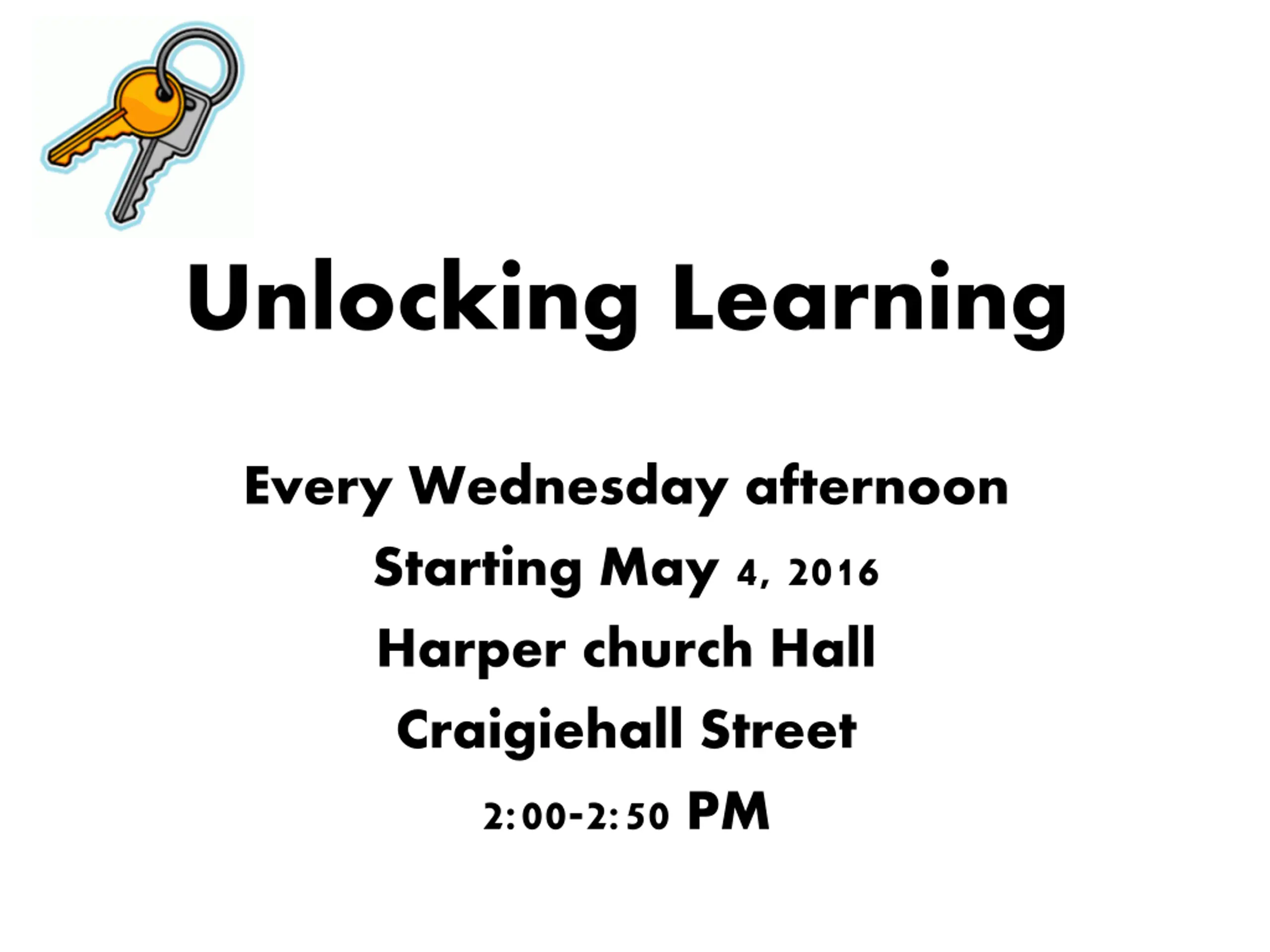 Unlocking Learning Every Wednesday afternoon Starting May 4, 2016 Harper church Hall Craigiehall Street 2:00-2:50 PM