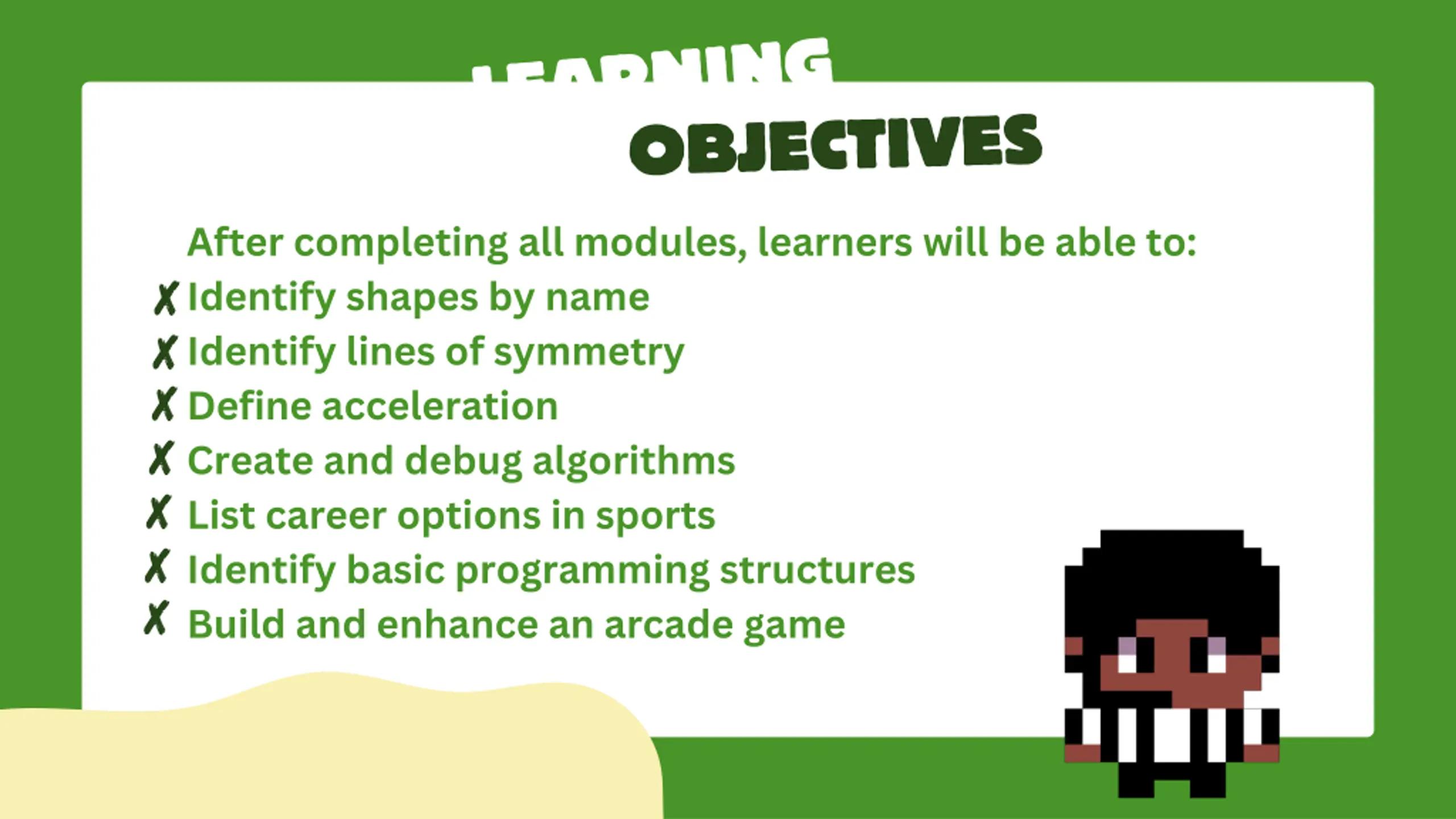 After completing all modules, learners will be able to: Identify shapes by name Identify lines of symmetry Define acceleration Create and debug algorithms List career options in sports Identify basic programming structures Build and enhance an arcade game X X X X X X X
