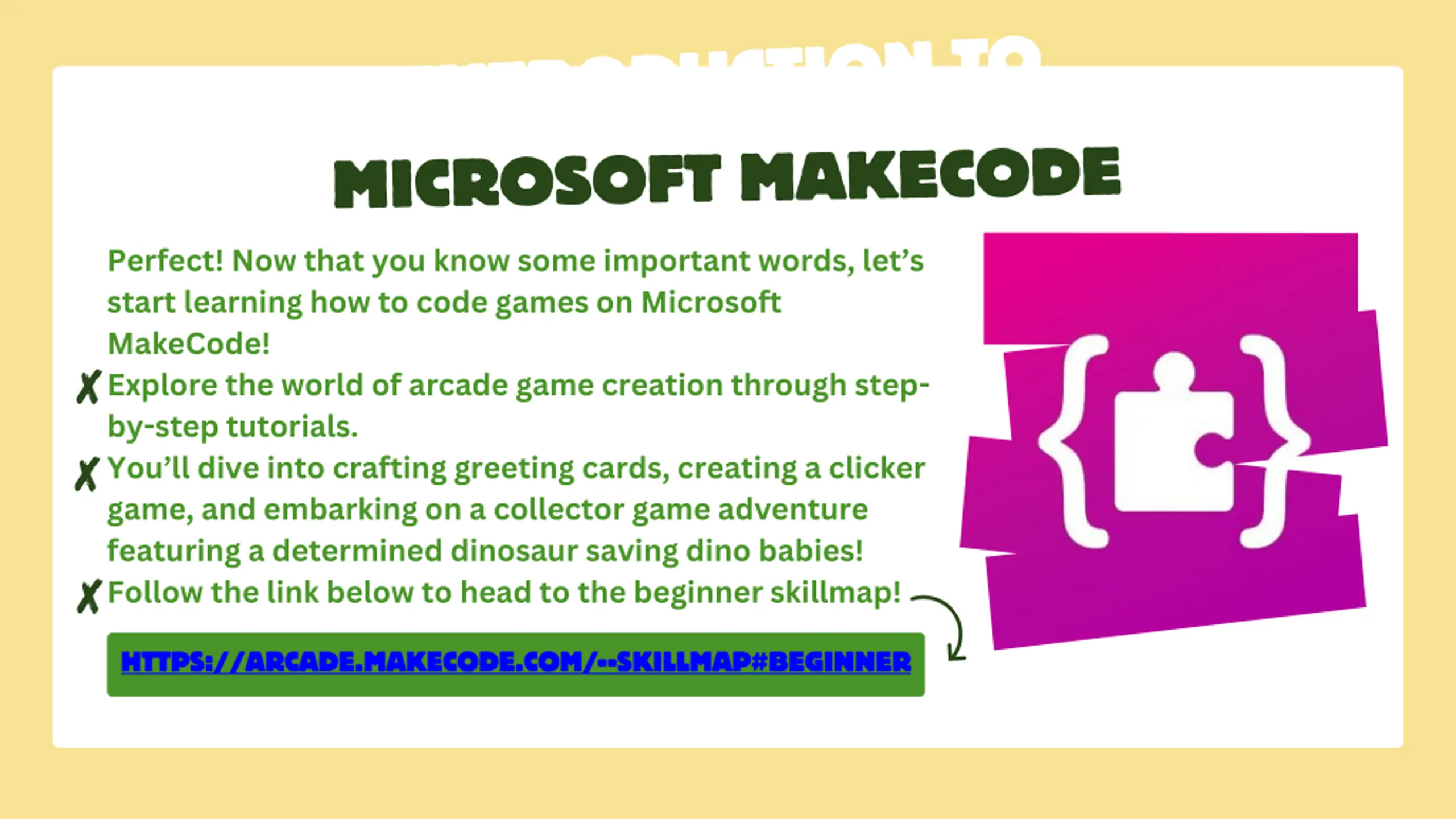 Perfect! Now that you know some important words, lets start learning how to code games on Microsoft MakeCode! Explore the world of arcade game creation through step- by-step tutorials. You ll dive into crafting greeting cards, creating a clicker game, and embarking on a collector game adventure featuring a determined dinosaur saving dino babies! Follow the link below to head to the beginner skillmap! X X X