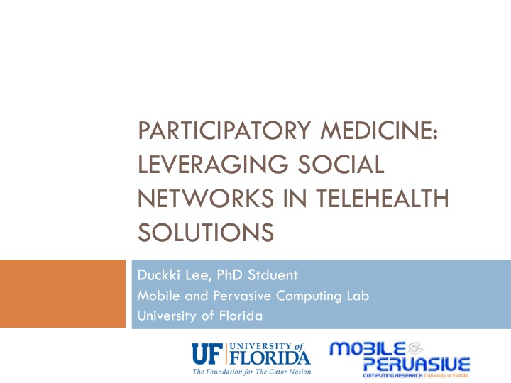 PARTICIPATORY MEDICINE: LEVERAGING SOCIAL NETWORKS IN TELEHEALTH SOLUTIONS Duckki Lee, PhD Stduent Mobile and Pervasive Computing Lab University of Florida